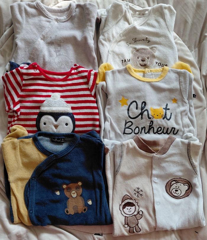 6 pyjamas 1 pièce manches longues garçon 3 mois en très bon état. 1 qui a Légère taches et marque inconnue. -Type de produit : Pyjamas -Univers : garçon -Taille : 3 mois / 62 cm -Marque(s) : in extenso, newborn C&A, sucre d'orge, influx, caramouille -Couleur(s) : blanc, rouge,gris, jaune, bleu/marine, marron/beige. Réductions de lots activé, jusqu'à-50%. A partir de 15€, prix négociable dans la limite du raisonnable. Envoie rapide dans les 24h ➡️ 📦