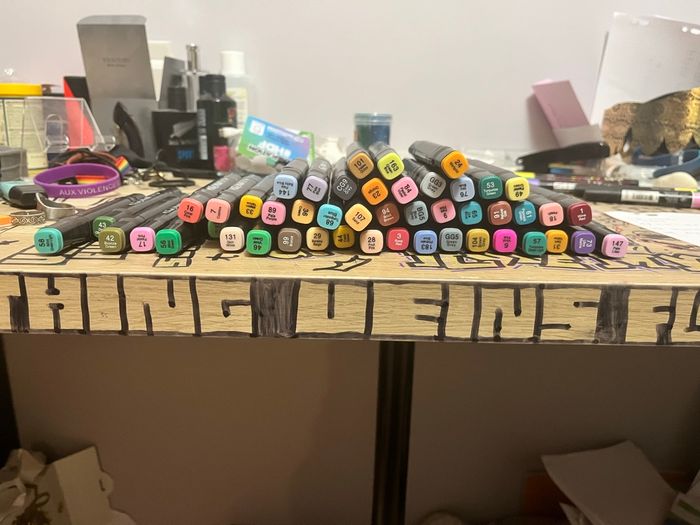 Lot de 48 markers de la marque MIKA Déjà bien utilisés Encore bien fonctionnels Idéal pour débutant, entraînement ou création Couleurs variées Testes avant mise en vente Prix négociable Vente urgente 🚨