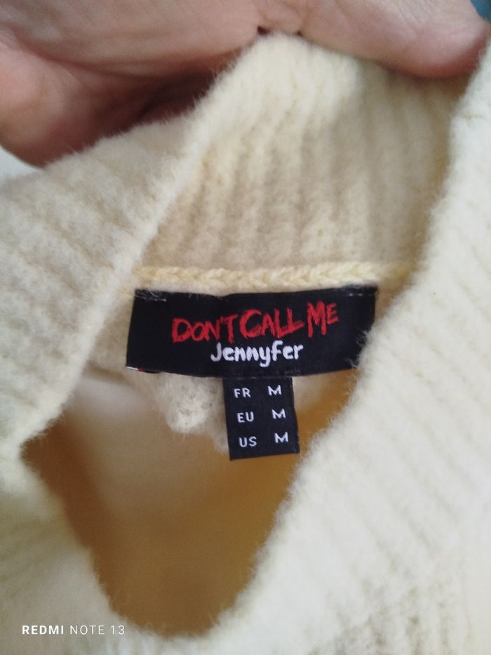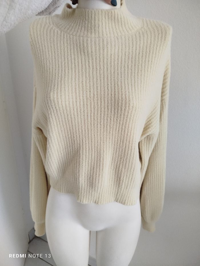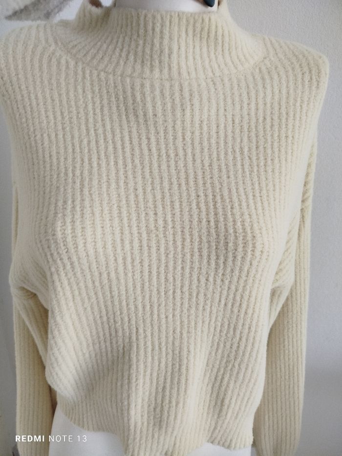 #kytieMfemme. Pull court oversize taille M de marque Jennifer jaune pastel col un peu montant super doux côtelé très très doux en état neuf 100 % polyamide mesure des épaules 68 cm hauteur 50 cm réf 9090