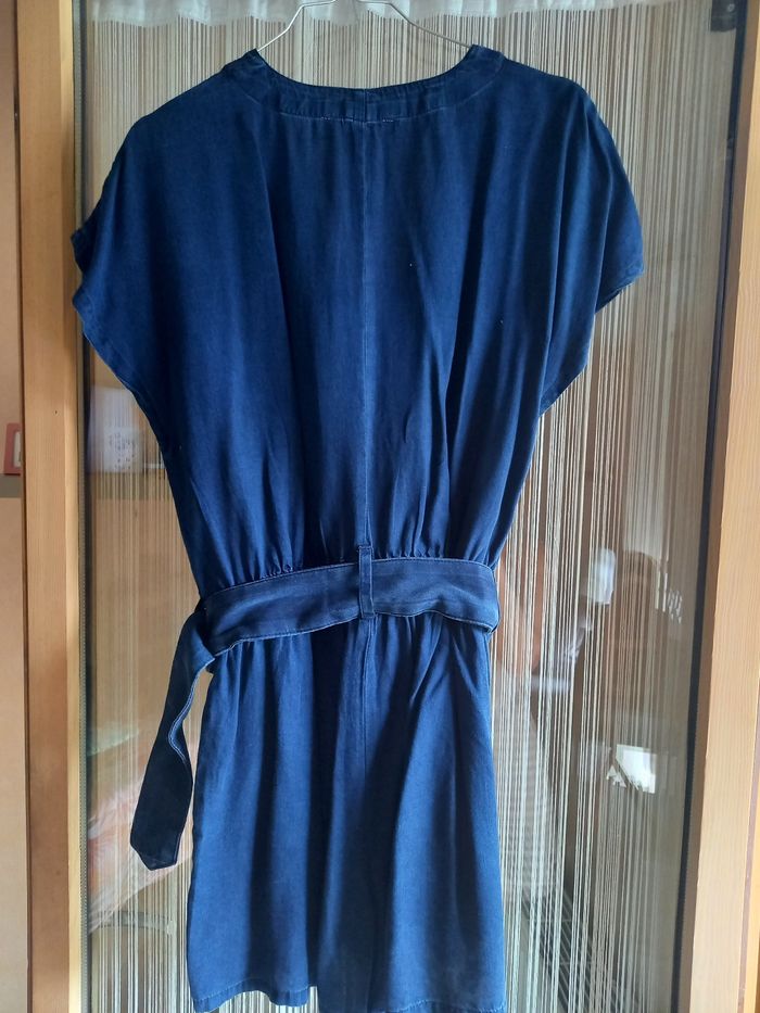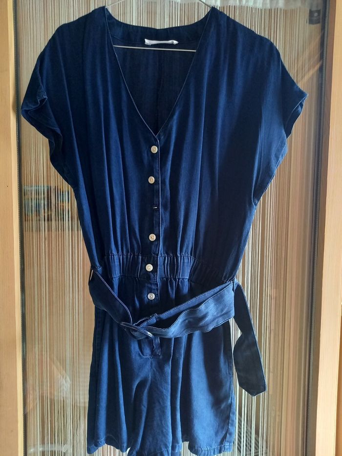 Jolie combinaison en viscose, boutonnée, ceinture et poches. Taille un peu petit. Denim bleu jean. Portée 1 fois