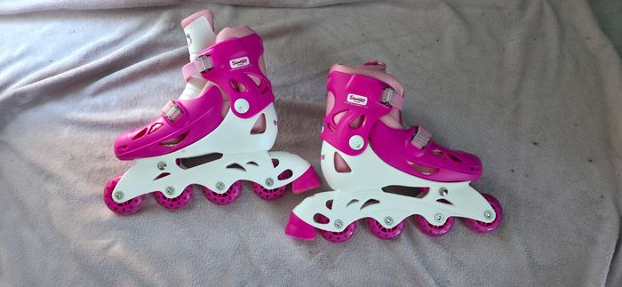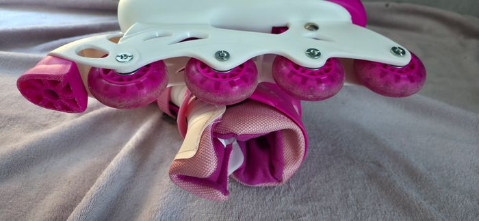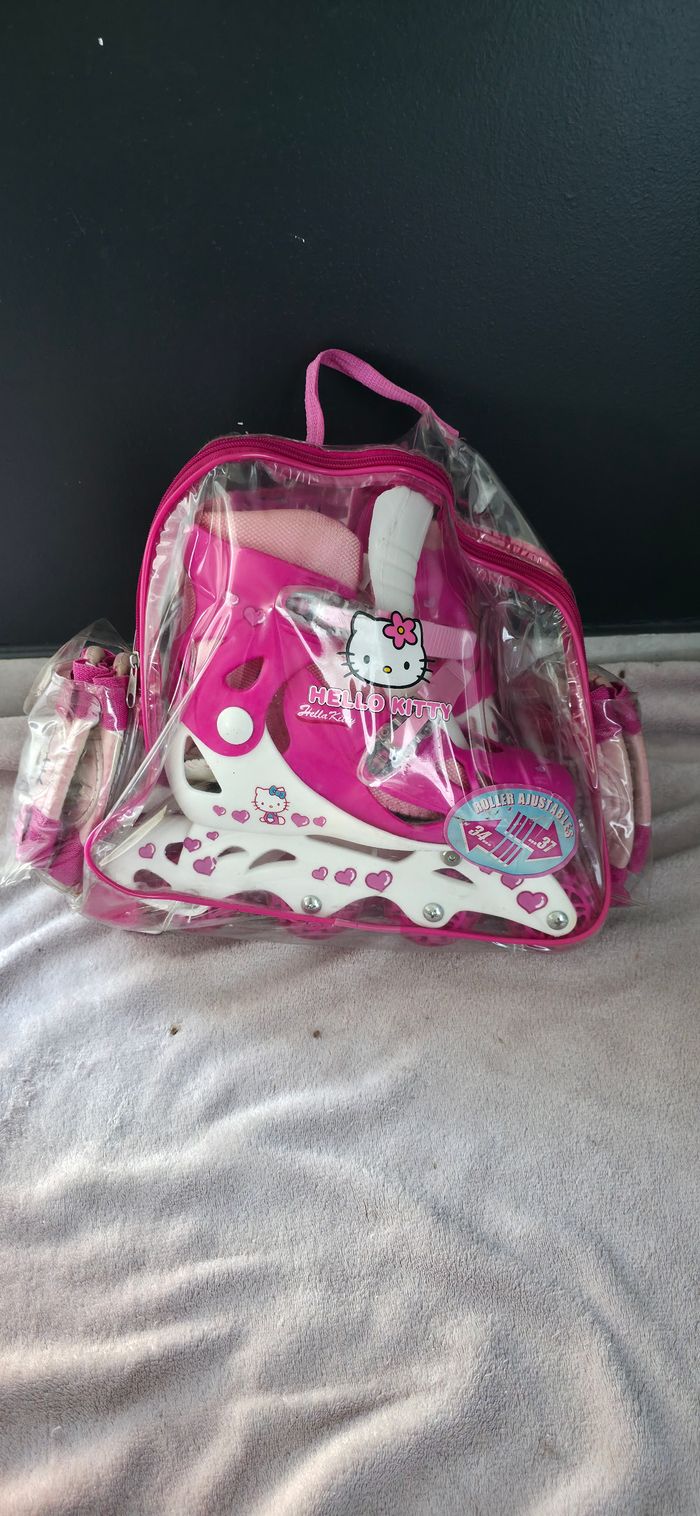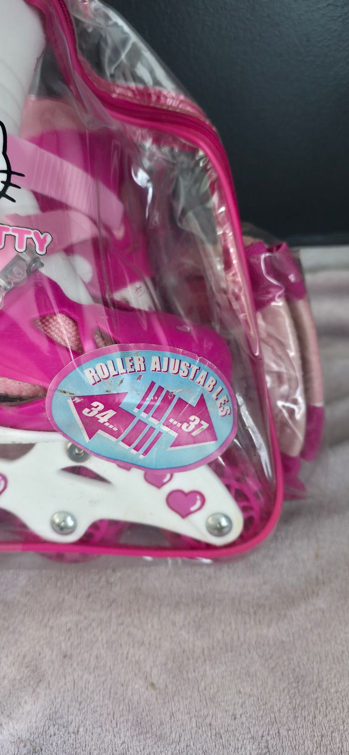 Vends une paire de rollers en ligne Hello Kitty (licence officielle Sanrio) en très bon état. Parfaits pour apprendre à patiner tout en restant stylée ! ​Points forts : ​Taille évolutive : Ajustables du 34 au 37, ce qui permet de les garder plusieurs années. ​Pack complet : Vendus avec leurs protections assorties (genouillères et coudières) et le sac de transport transparent d'origine. ​Confort & Sécurité : Coque rigide pour un bon maintien de la cheville et fermeture par boucles micrométriques faciles à manipuler. ​État : ​Très bon état général. ​Peu utilisés : les roues et les freins sont encore très peu usés (voir photos). ​Quelques légères marques d'usage sur la coque plastique, mais rien qui n'altère l'esthétique ou le fonctionnement. ​Inclus dans le lot : ​La paire de rollers. ​4 protections (coudes/genoux) Hello Kitty. ​Le sac de transport rose à poignée. N'hésitez pas à me contacter si vous souhaitez plus de renseignements ou de photos !