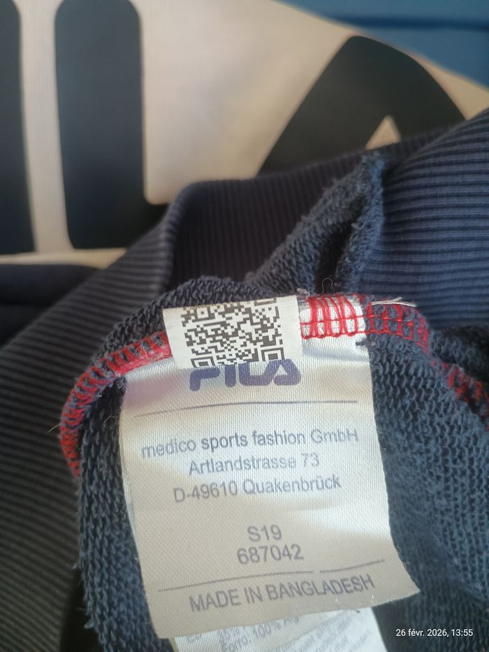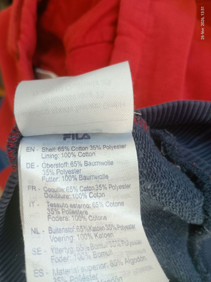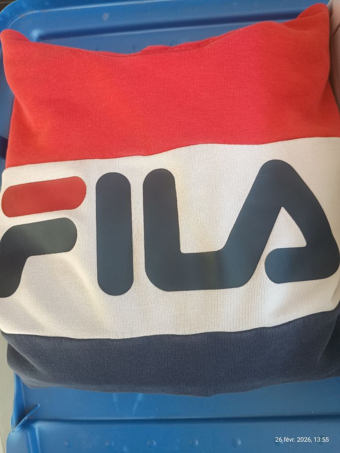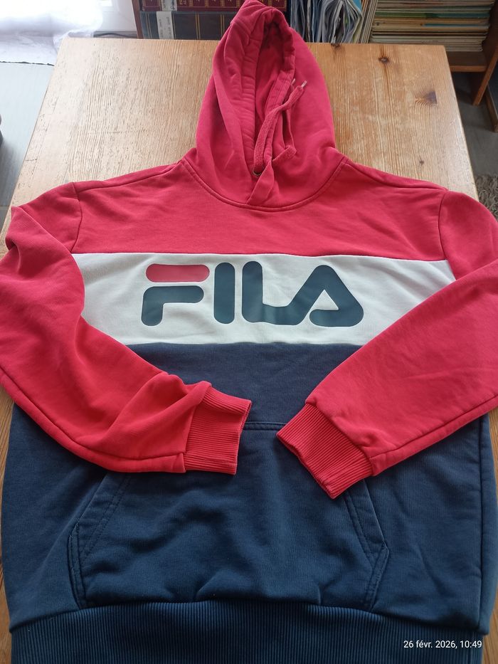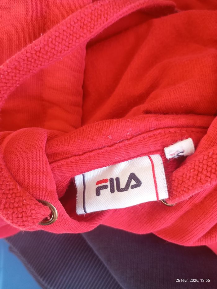 Je vends ce sweat à capuche FILA, aux couleurs emblématiques de la marque. Un incontournable du style sportswear à saisir ! - Type de produit : Sweat à capuche - Marque : FILA - Taille : S - Couleur : Multicolore (rouge, blanc, bleu marine) - Caractéristiques : Capuche, Poches latérales, Logo FILA imprimé N'hésitez pas à me contacter pour plus d'informations ou de photos.