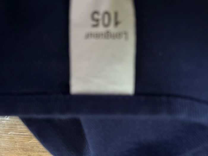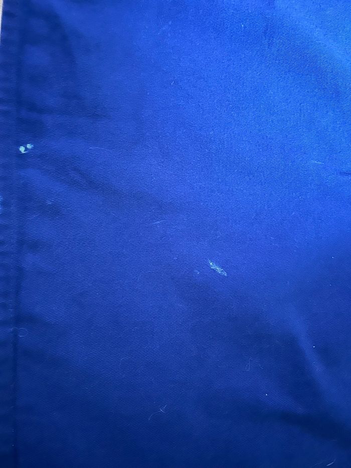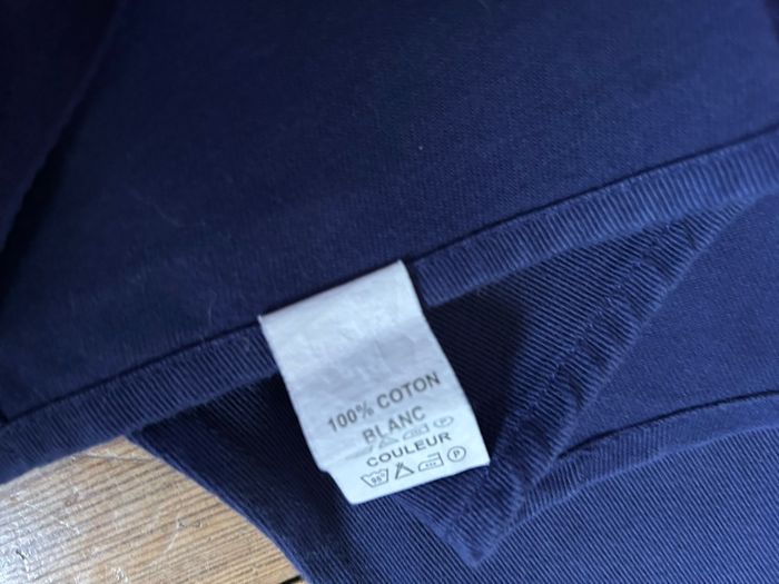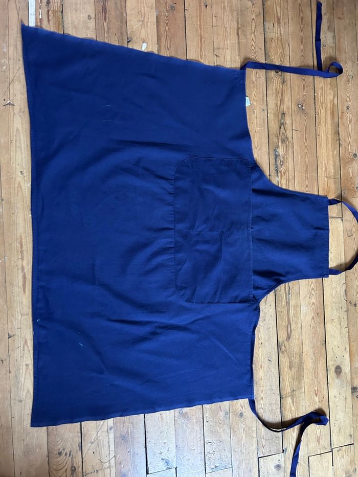 Tablier cuisine bleu marine Longueur 105 Grande poche devant séparée en deux 100% coton Largeur en bas 114,3 cm Longueur avec la bavette milieu devant sans les lanières 98 cm Bon état car petites taches (décoloration javel )