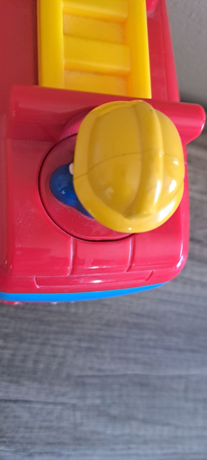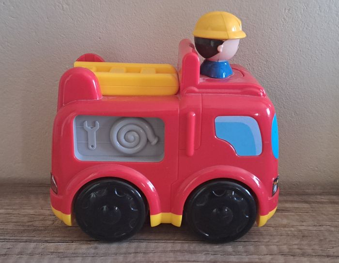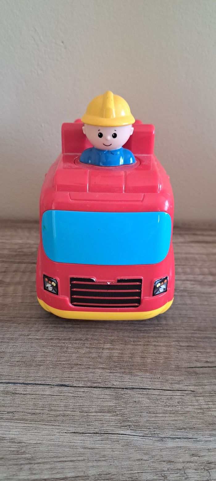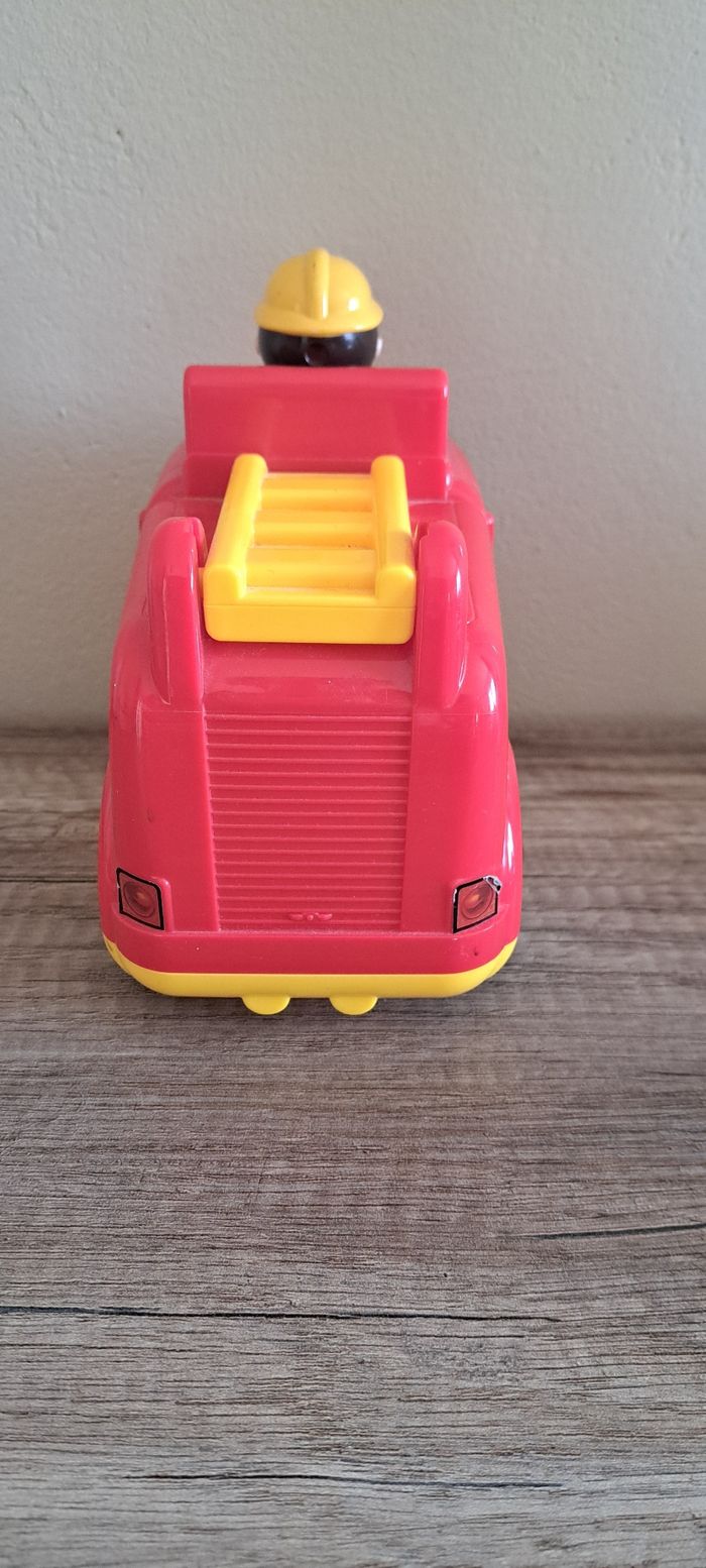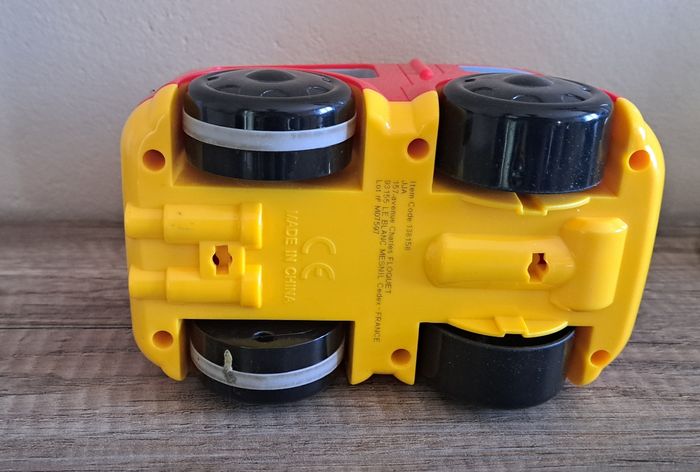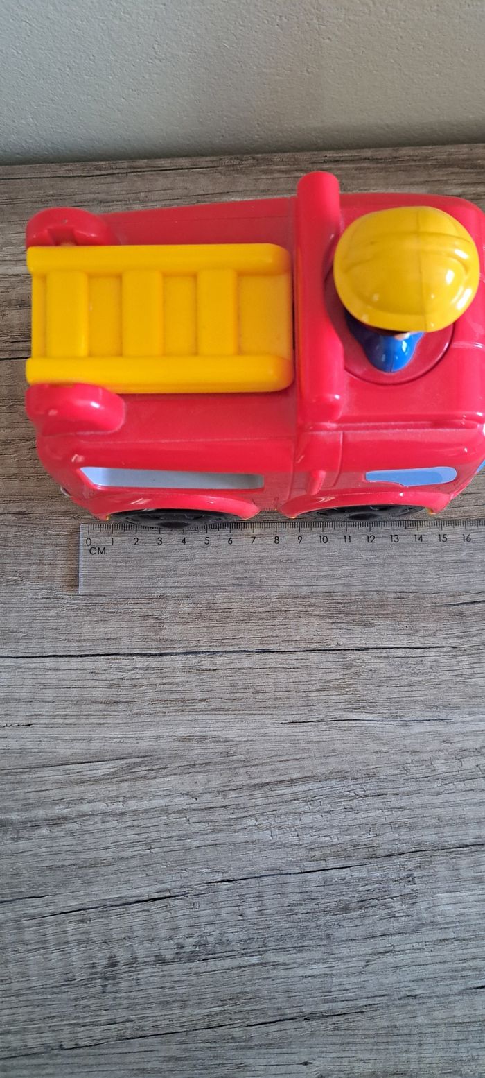 Petit camion de pompier Avance tour seul quand on appuie sur le pompier Légères traces d'usure sur le pompier, mais sinon, en parfait état, roule très bien. Environ 15 cms