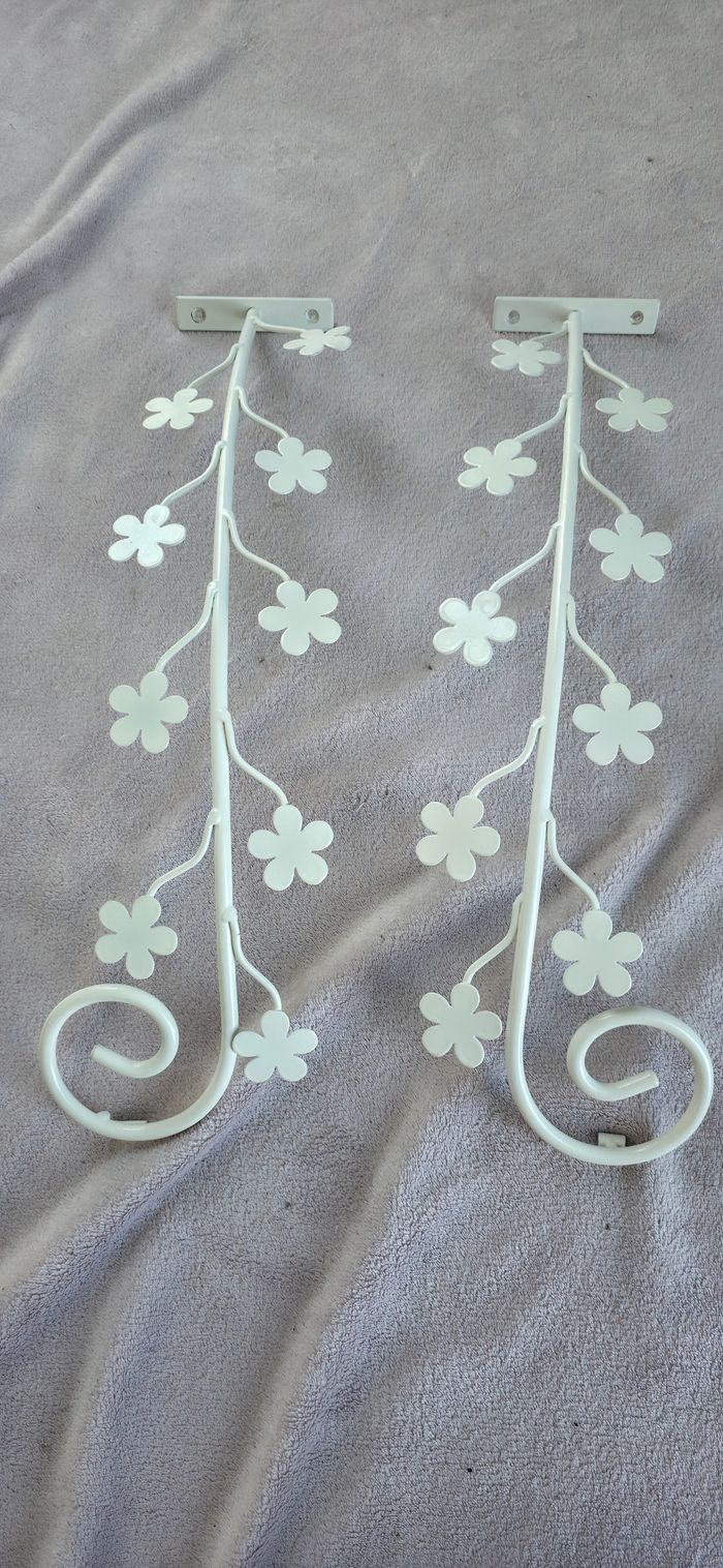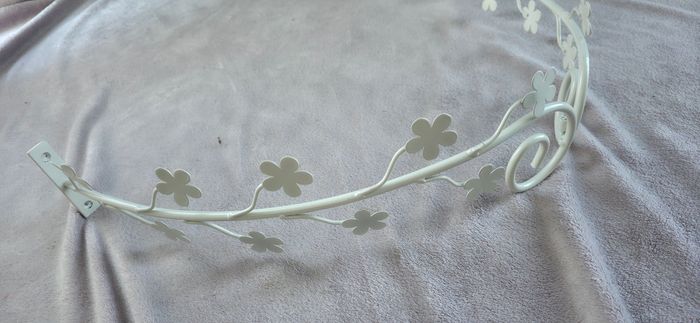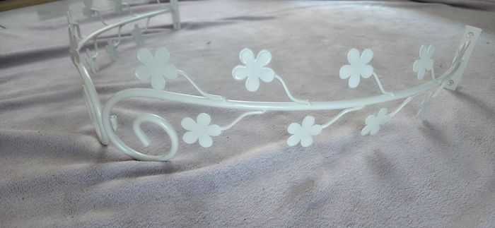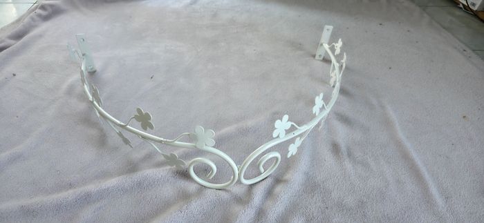 Vends un magnifique support de ciel de lit mural (aussi appelé couronne de lit) en fer forgé laqué blanc. ​Idéal pour apporter une touche de charme et d'élégance à une chambre d'enfant. Ce système permet d'installer facilement un voilage ou des rideaux légers au-dessus de la tête de lit pour un effet baldaquin. ​Détails du produit : ​Design : Motifs délicats de petites fleurs et volutes élégantes. ​Matériau : Métal robuste (fer forgé). ​Couleur : Blanc satiné. ​Installation : Très simple, se fixe au mur grâce à deux platines pré-percées (vis non fournies). ​État : Très bon état général. ​Parfait pour une décoration style campagne chic, princesse ou bohème. N'hésitez pas à me contacter si vous souhaitez plus de renseignements ou de photos !