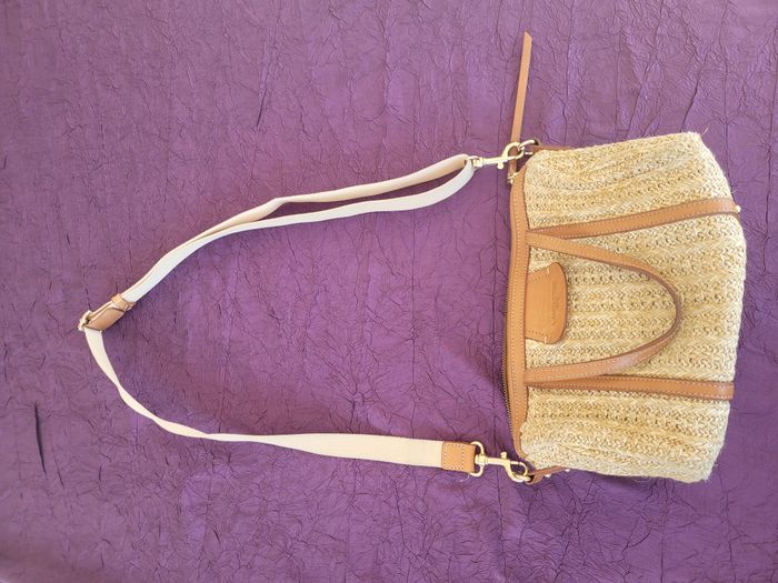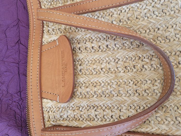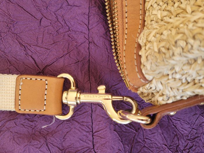 Sac Lancaster en raphia écru et cuir marron clair 1 grande poche intérieure et 3 petits compartiments Bandoulière réglable Clous en métal de protection sur la face inférieure Aucun manque ni trou mais tâches de stylo à l'intérieur des poches compartiments Fermeture par fermeture éclaire Très bon état Prix imbattable