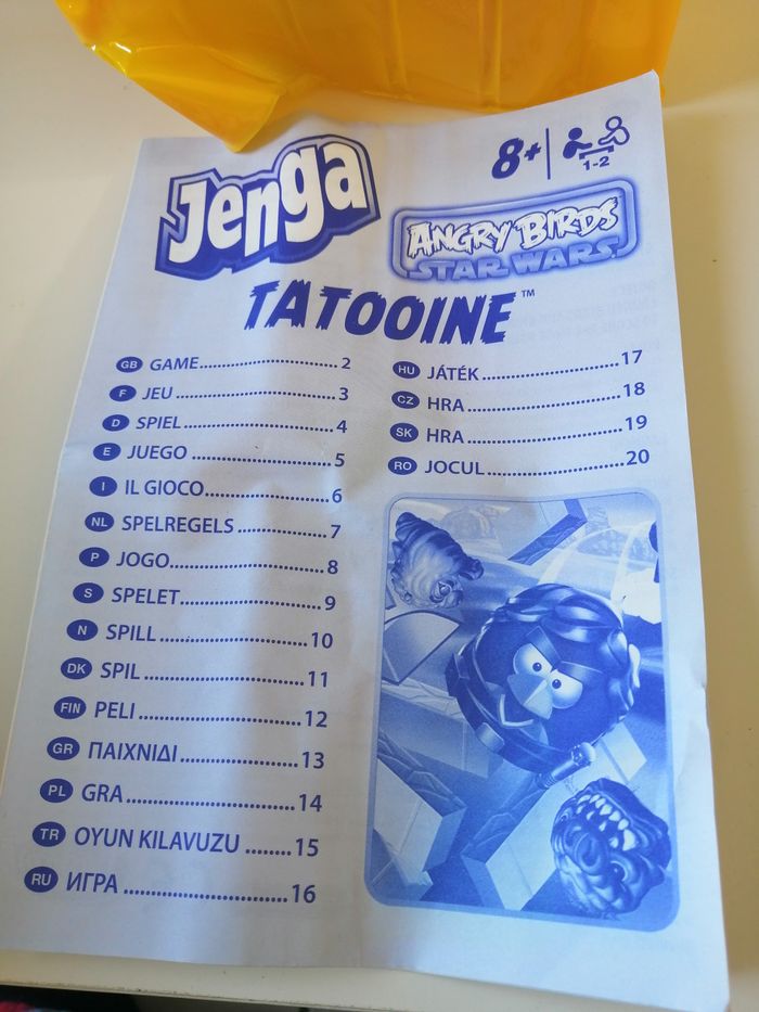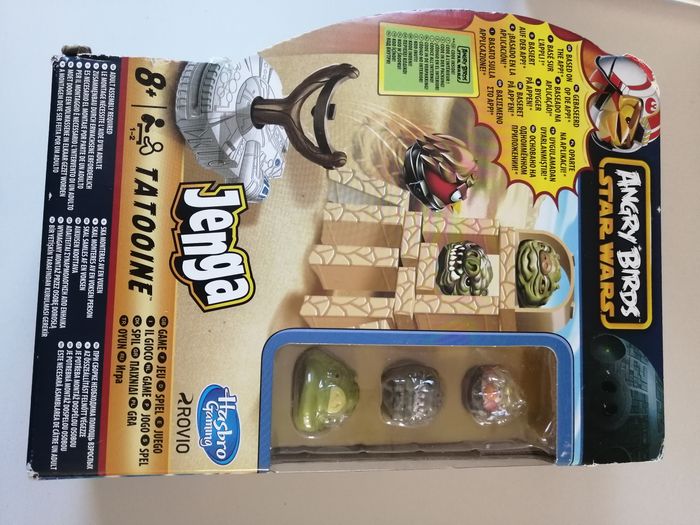 jenga angry bird's star wars jeu hasbro avec règle du jeu multi langues à partir de 8 ans catapultez la figurine pour faire tomber la structure à noter petit accroc sur un dé, n'empêche pas le jeu peut présenter des traces du jeu