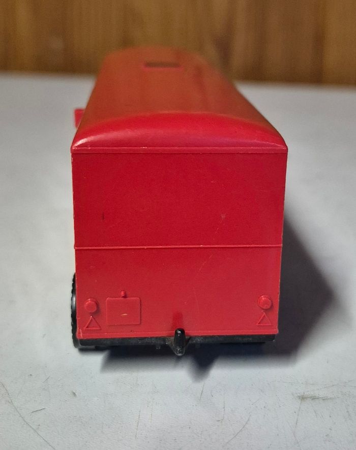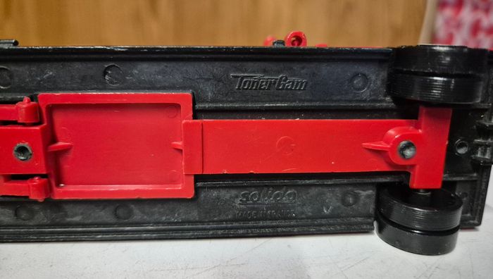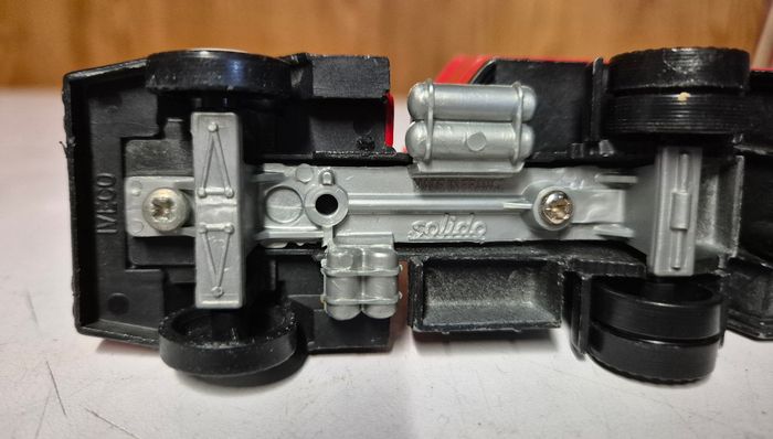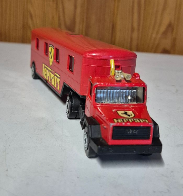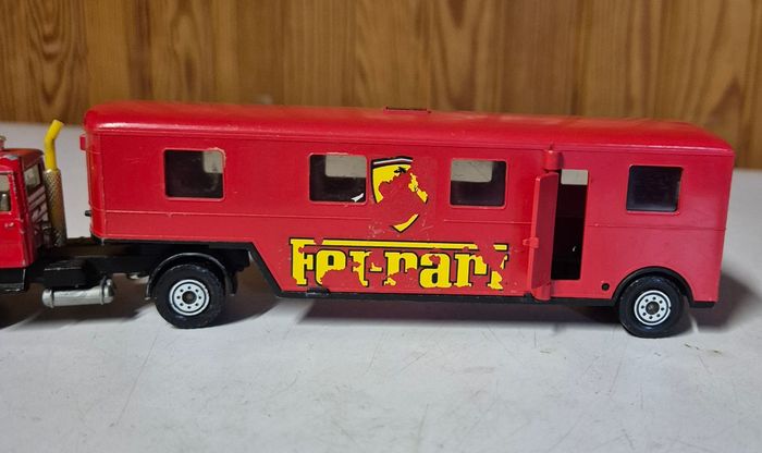 Camion Solido Toner Gam, modèle Iveco aux couleurs Ferrari. Ensemble composé de la cabine Iveco et de la grande remorque rouge avec fenêtres latérales et porte arrière ouvrante. Marquage Solido – Toner Gam présent sous le châssis. Décor Ferrari d’origine encore visible mais usé. Modèle vintage avec traces d’usage : peinture écaillée, autocollants abîmés et marques du temps, mais structure complète et roues fonctionnelles #solido #tonergam #iveco #camionferrari #ferrarivintage #camionminiature #collectionjouets #diecast #transporteurferrari