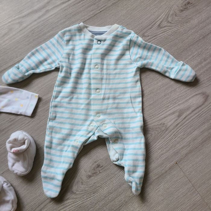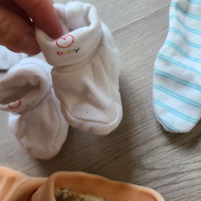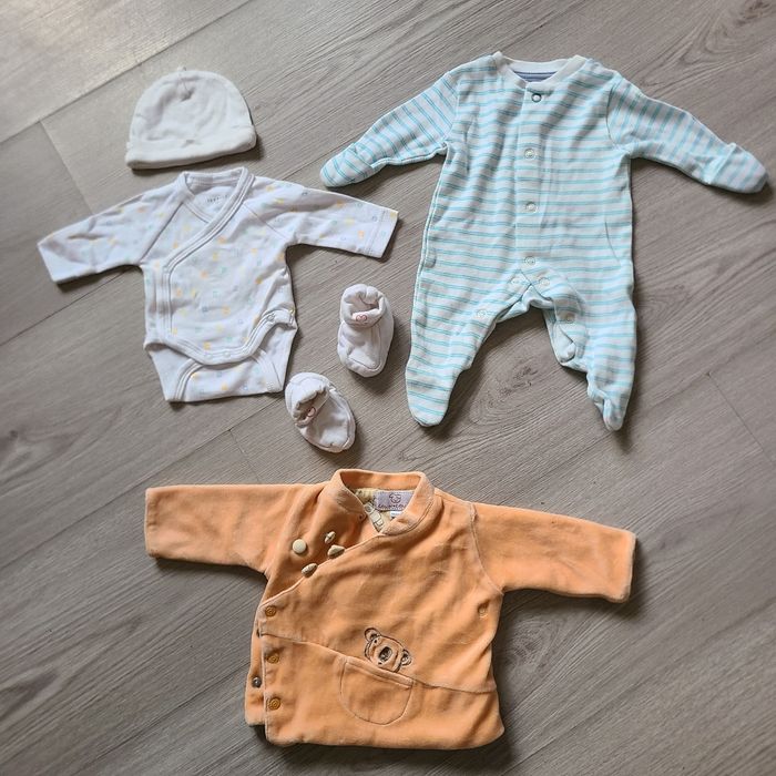 Lot bébé prématuré Comprend : * un pyjama qui s'ouvre sur le devant et entre les jambes, avec moufles intégrées * bonnet * chaussons avec cœur ❤️ baby * gilet * body manches longues (neuf)