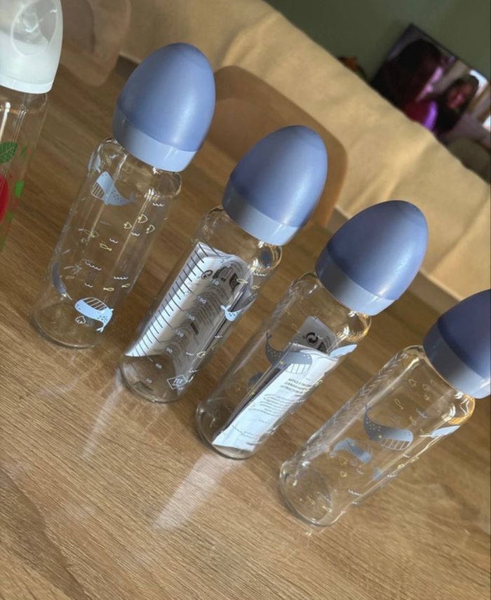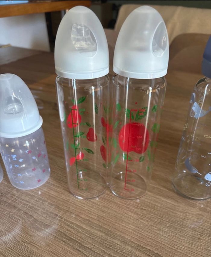 Lot de 6 biberons 240 ml en verre de la marque TEX neuf 2 biberons Auchan 120 ml en plastique (1 neuf et l’autre a été testé une fois mais ne convient pas)