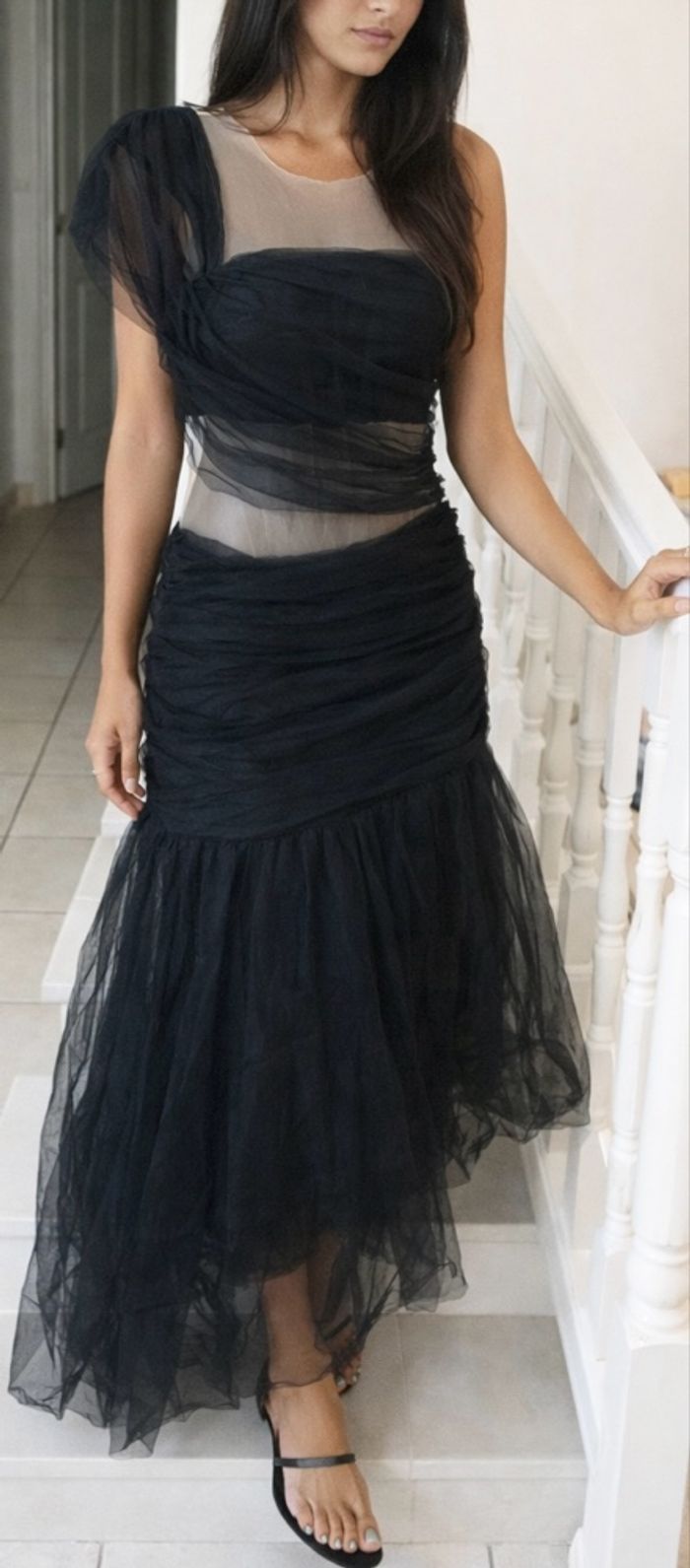 Je vends cette somptueuse robe de soirée de la marque Fashion Nova (collection NovaLuxe). C'est une pièce forte, élégante et très travaillée, idéale pour un événement, un gala ou un mariage. • Design : Robe longue avec un jeu de transparence en mesh nude et des empiècements de tulle noir drapé. • Coupe : Effet bustier drapé avec une épaule en tulle asymétrique. • Corps ajusté avec un travail de fronces (ruché) qui met en valeur la silhouette. • Bas de la robe évasé en tulle vaporeux. • Dimensions : Longueur totale d'environ 160 cm. Neuf avec étiquette