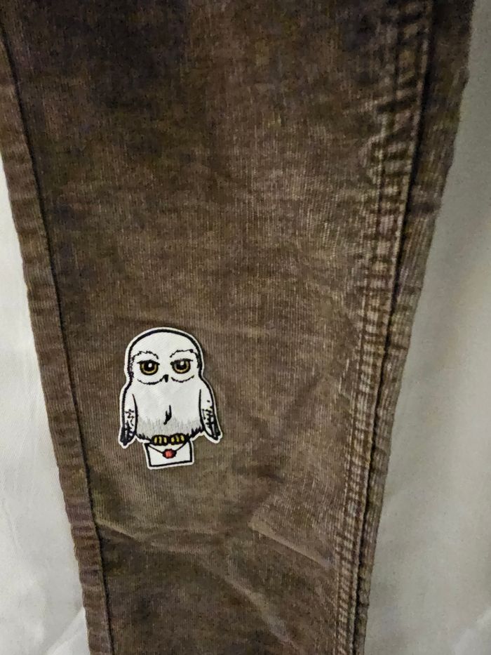 Pantalon slim en velours marron avec écusson à l'effigie de la chouette Edwige d'harry Potter. Deux poches devant et deux derrière. Taille réglable. Se ferme par fermeture et bouton. Marque : H&M Taille : 140