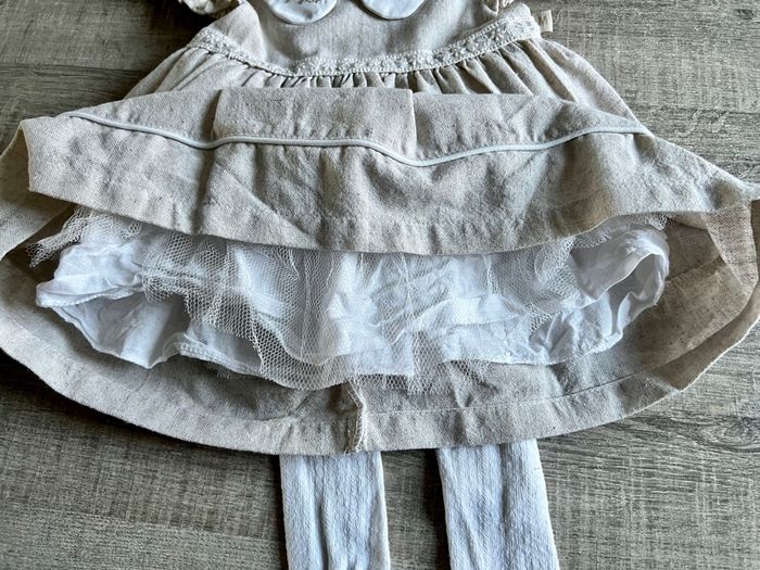 Robe beige en lin, doublée avec du tulle pour un effet volume. Elle a été portée une fois, idéale pour un baptême. Collants blancs neufs