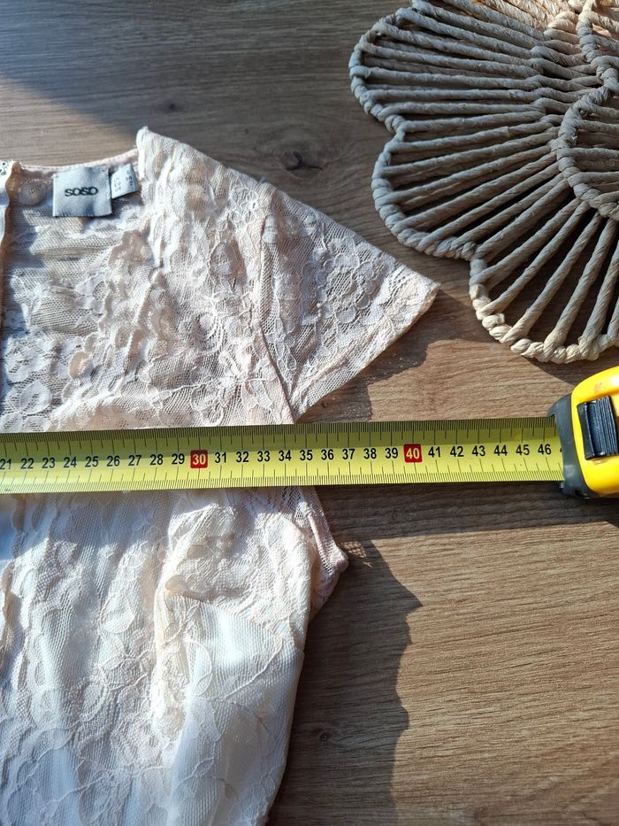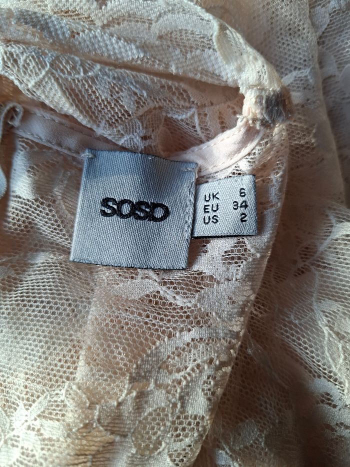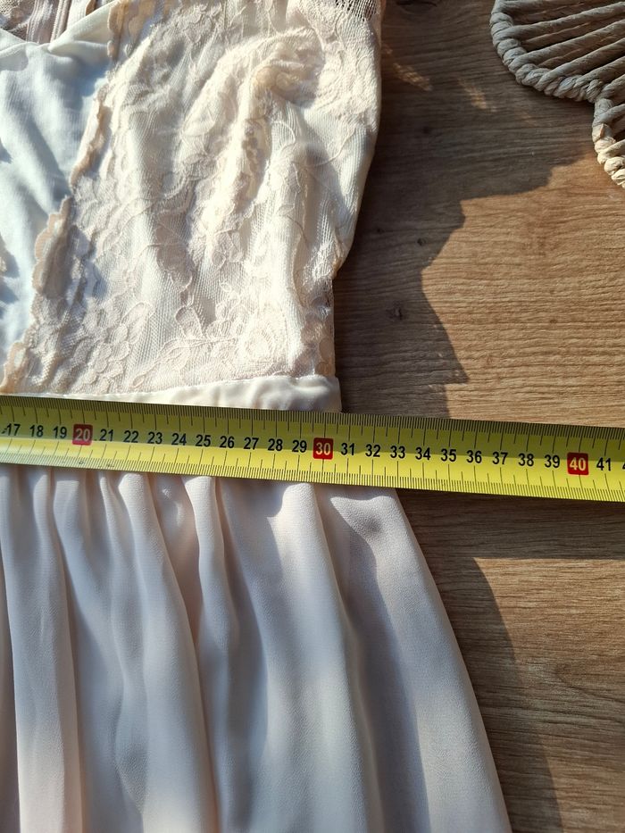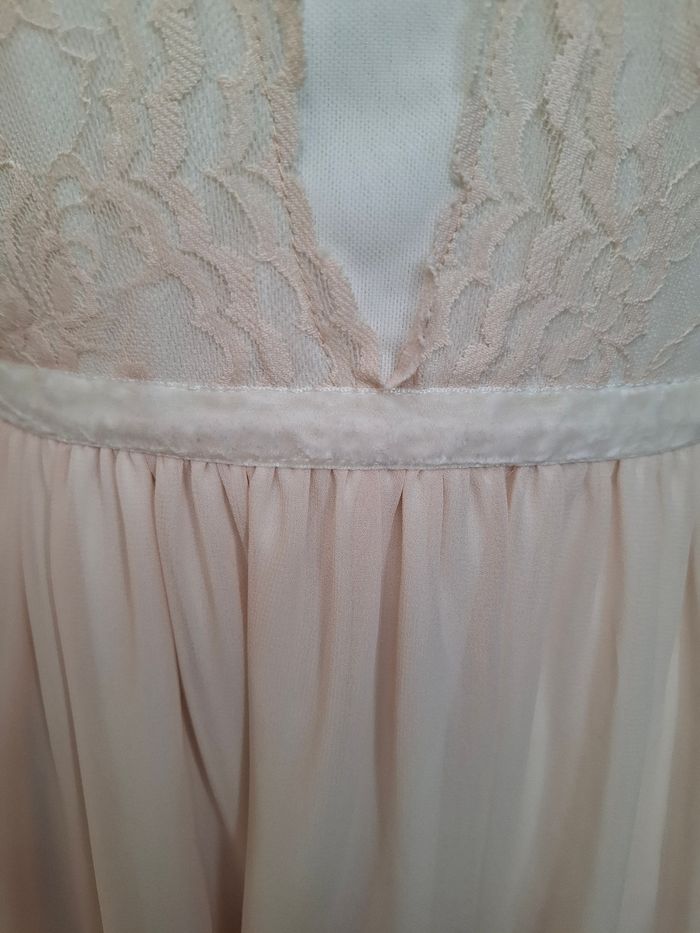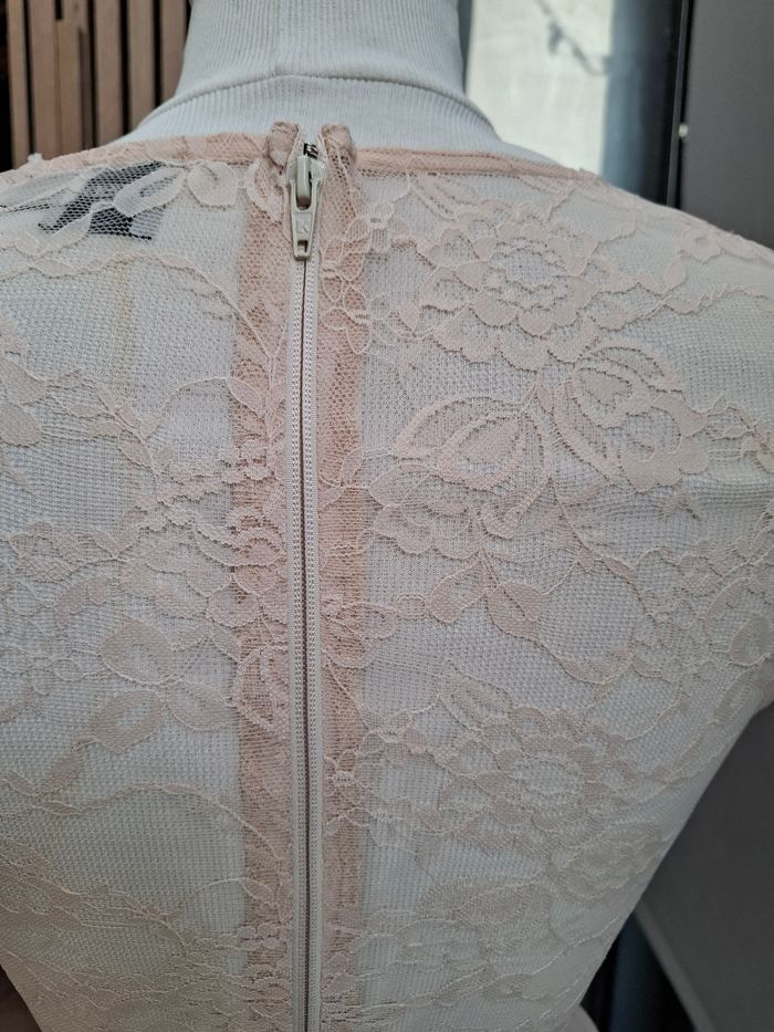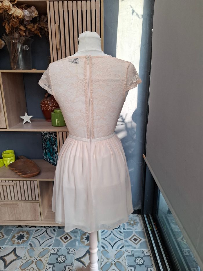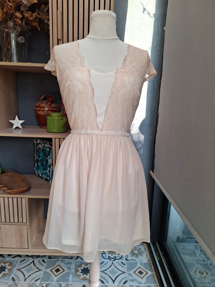 Robe courte Asio, taille 34 (XS). Couleur vieux rose / nude poudré. Magnifique buste en dentelle florale avec décolleté en V plongeant sur empiècement blanc. Jupe fluide et légère. Idéale pour un mariage, un baptême ou une soirée d'été.