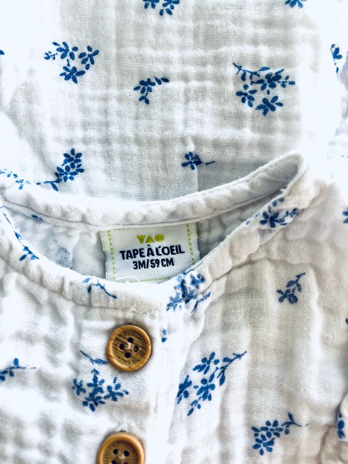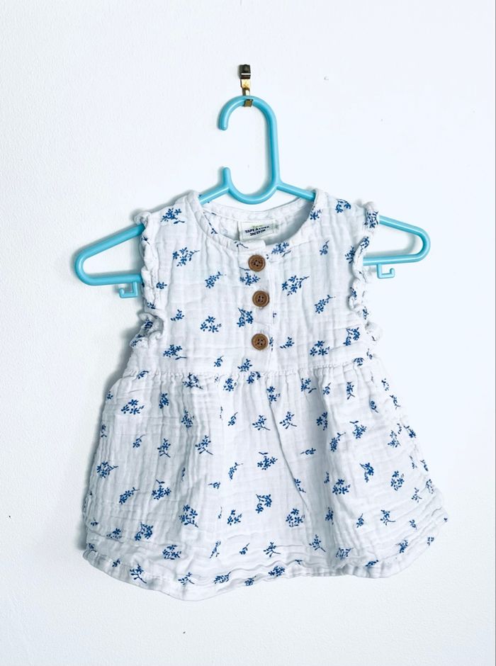 Robe en gaz de coton « Tape à l’œil » T 3 mois, petits boutons devant et volants sur les manches, blanches avec petites fleurs bleues. D’autres vêtements 1/3/6/9 mois Envoie rapide
