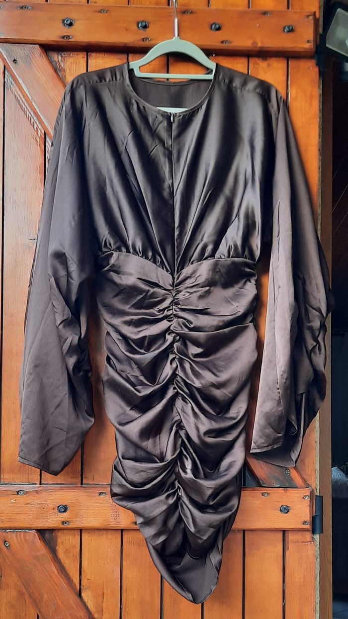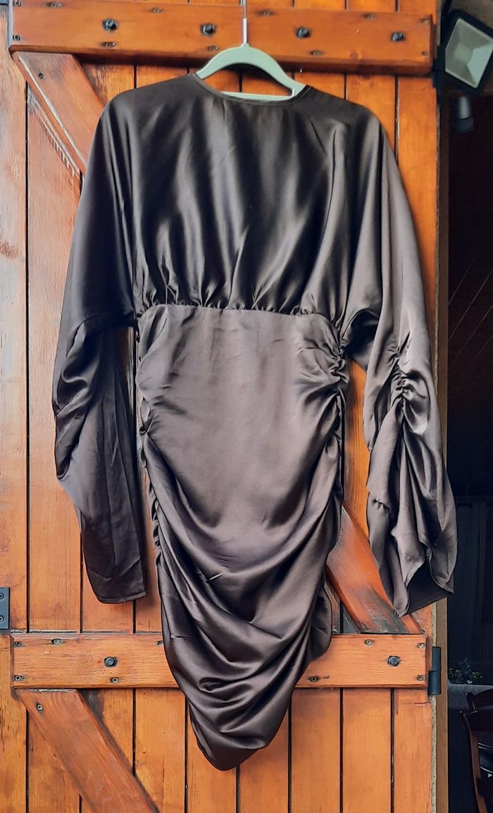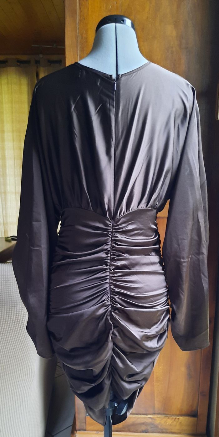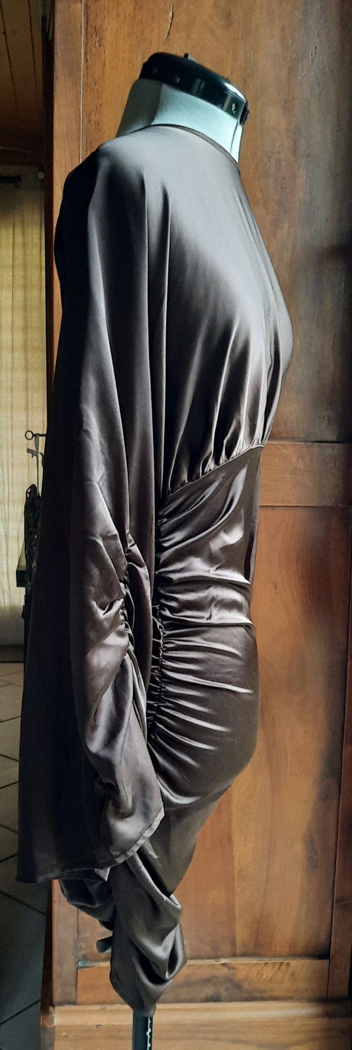 Robe tissu satiné, couleur marron PrettyLittleThing, taille 34 Manches larges plissées sur le dessus, forme chauve souris fermeture par un zip dans le dos fronces sur les côtés et le long du dos dans le prolongement du zip 100 % polyester taille à plat : 33 cm Hauteur : 90 cm