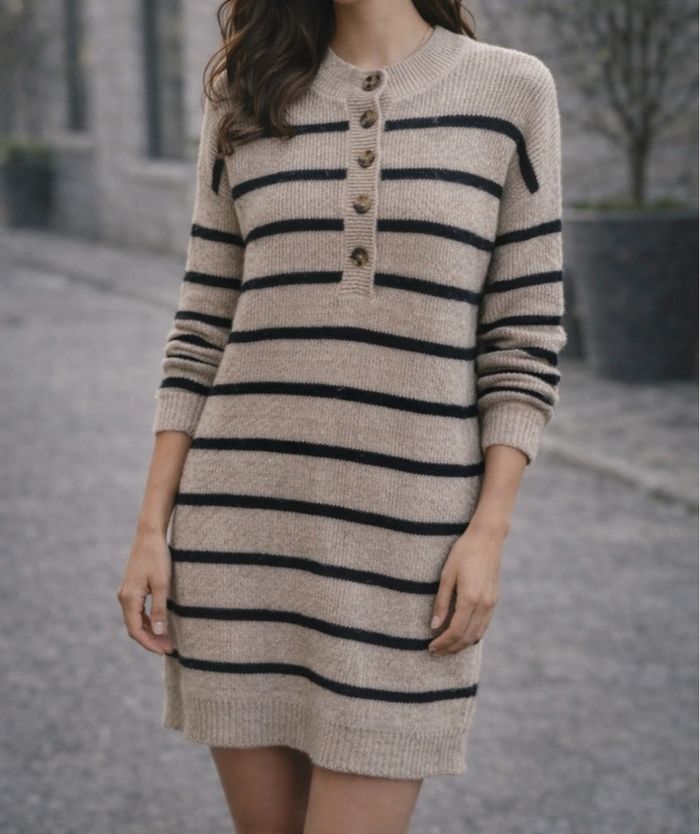 Robe pull en maille pulls épais et douce, rayures noires. Col rond boutonné sur le haut. Confortable.