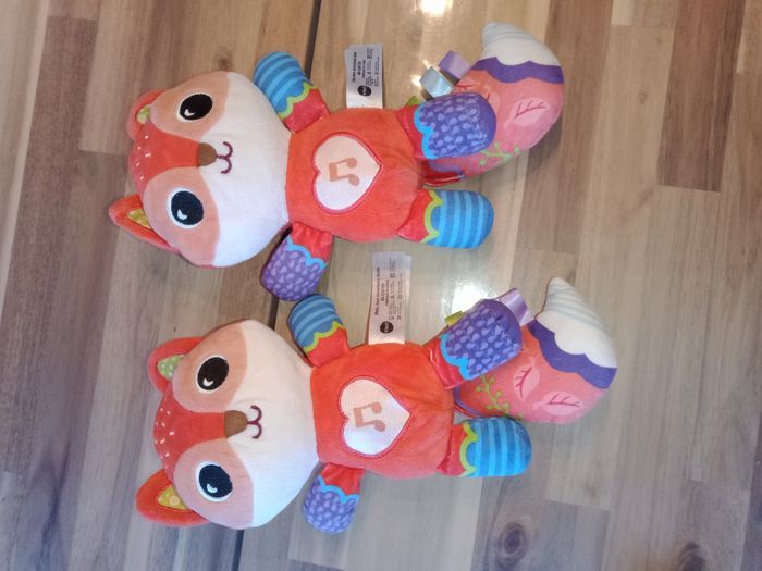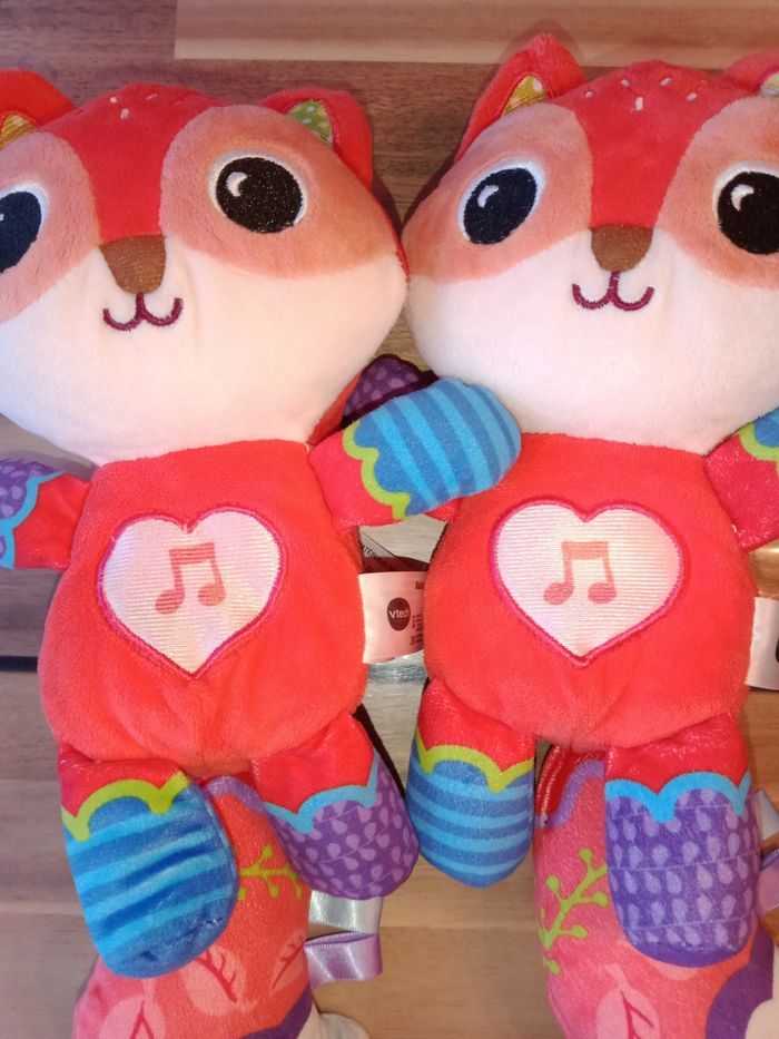 Lot de 2 peluches musicale malo le renardeau de chez vetch. Sort de la machine a laver En parfait état. Les boîtiers musicaux et les scratchs sont en très bon état. Un était à la maison le second à la crèche. ‼️Piles non incluses‼️