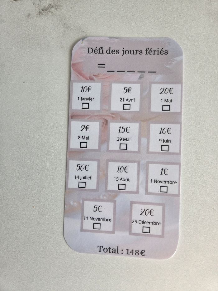 Defi budget des jours fériés Plastifié Format A6 pour pochettes zip Envoie rapide 😊