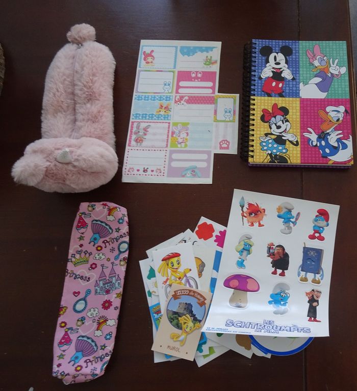 Lot de papeterie pour petite Fille comprenant: - 1 trousse rose en peluche chat et 1 trousse rose à motifs princesse Neuve - 1 carnet à spirale Disney Minnie Neuf - des étiquettes à motifs lapins - des autocollants