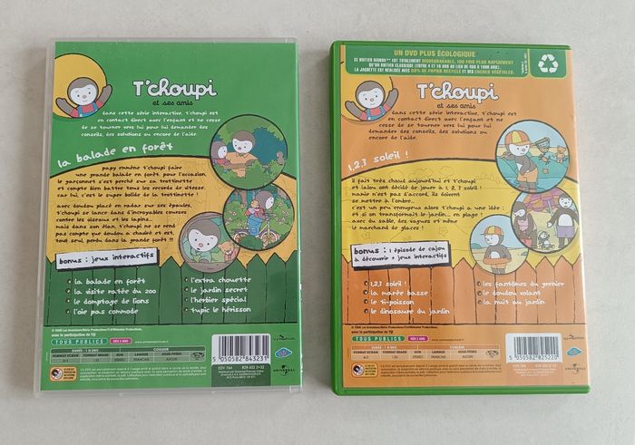 Bonjour, Vends un lot de 2 DVD enfant : T'choupi et ses amis : 🔷 La balade en forêt 🔷 1,2,3 soleil Bon état, fonctionnels.