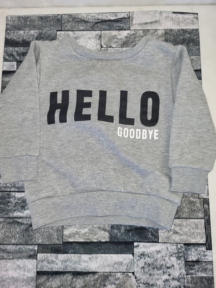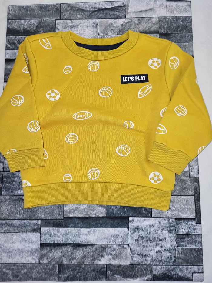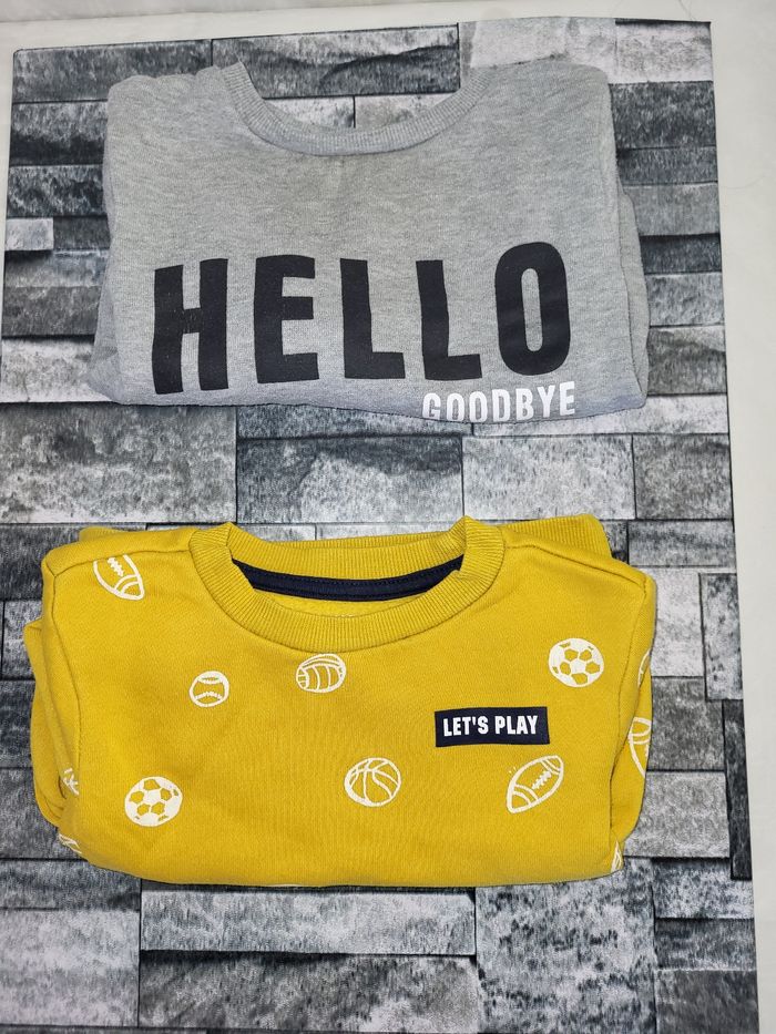 Description : Un lot de deux petits sweats craquants et pleins de peps, sélectionnés par Jardin Secret. Parfaits pour apporter de la couleur et du confort aux tenues de votre enfant. ​Le lot comprend : ​1 sweat gris chiné avec l'inscription "Hello" sur la poitrine et des bandes blanches sur les manches. ​1 sweat jaune motif ballon de sport i, très tendance et lumineux. ​Le style : Finitions élastiquées aux poignets et à la taille pour un look soigné et un confort optimal. ​Matière : Molleton souple et léger, idéal pour la mi-saison ou à superposer. ​Marque : Primark. ​Taille : 12 mois (80 cm). ​État : Très bon état, prêt à être porté !