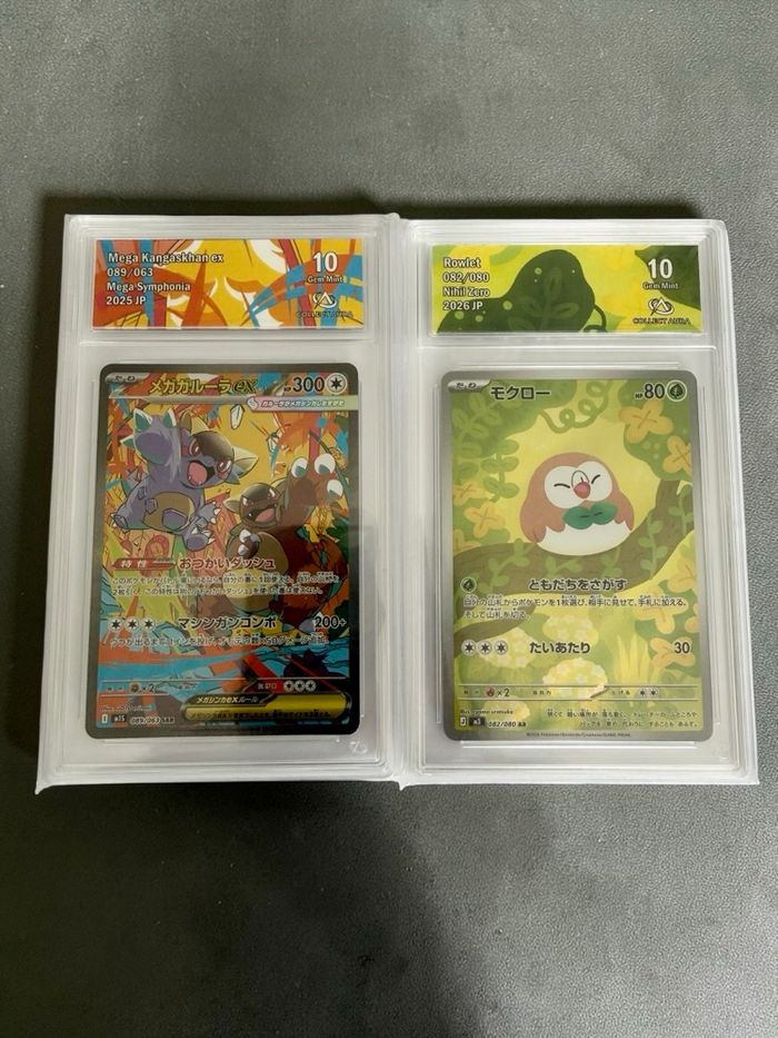 Description : Petit lot Pokémon gradé idéal début collection. Contenu : ✔ Mega Kangaskhan ex (Méga Kangourex) — 10 ✔ Rowlet AR (Brindibou) — 10 Cartes japonaises gradées CollectAura. Parfait pour : • cadeau Pokémon • débuter collection gradée • investissement accessible 🎥 Préparation filmée 📦 Envoi protégé