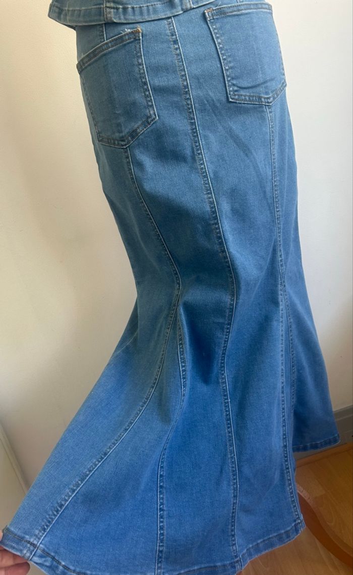 Magnifique ensemble en jean extensible , gilet et jupe longue sirène, 100% coton , Longueur jupe 80 cm Taille L ou 40