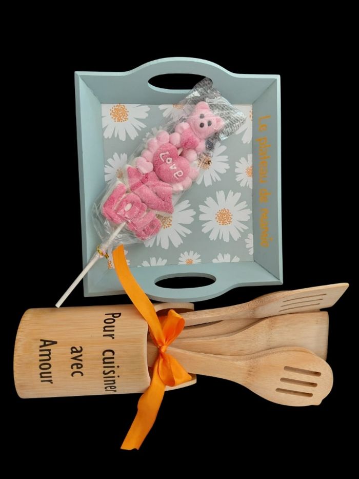 🌸 Coffret Spécial Fête des Grands-Mères 🌸 Parce que nos mamies méritent le plus beau des cadeaux, découvrez notre coffret exclusif pensé pour célébrer leur amour et leur talent en cuisine ❤️ Ce coffret unique se compose de : ✨ Un plateau personnalisé pour servir avec élégance 🍭 Une sucette gourmande pour une touche de douceur 🥄 Un pot à ustensiles 🍳 Et ses 5 ustensiles indispensables pour que Mamie nous mijote encore ses meilleurs petits plats À la fois personnalisé et pratique, ce coffret est le cadeau idéal pour lui faire plaisir tout en lui offrant un accessoire utile au quotidien. Un présent rempli d’amour, parfait pour lui dire “Merci Mamie” et célébrer tous ces délicieux moments partagés autour de ses recettes inoubliables 💕 🎁 Quantités limitées - Infos en MP