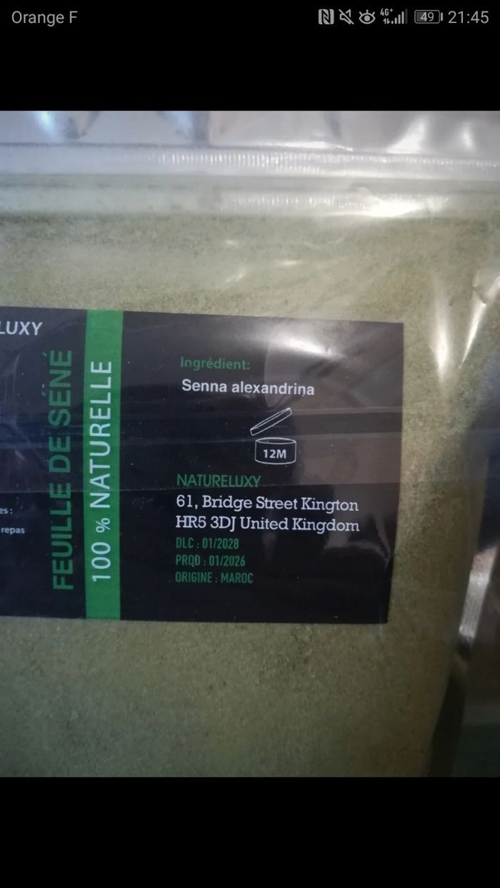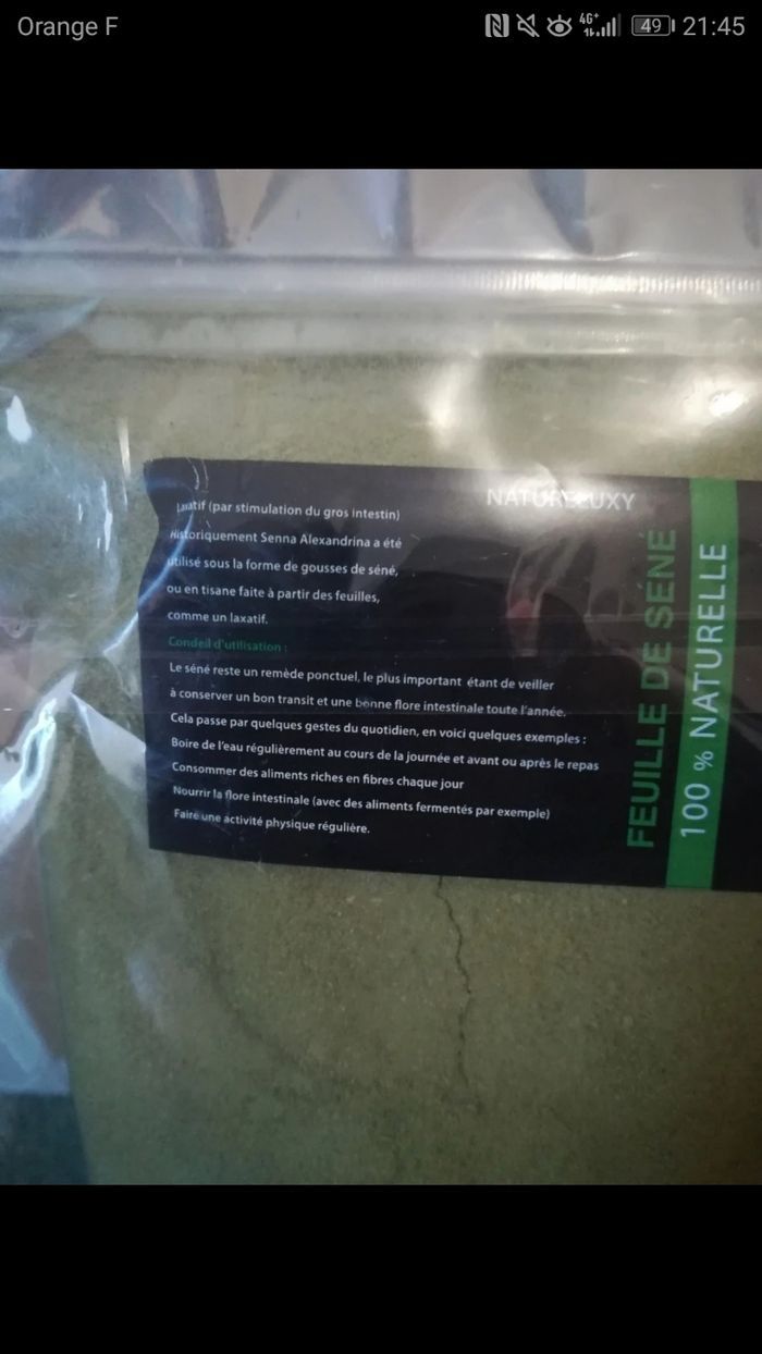 Gros paquet de feuille de séné en poudre 100% naturelle, neuf dans son emballage. Laxatif par simulation du gros intestin. Origine Maroc. Nom scientifique : Senna alexandrina. 2 paquets disponibles, dites moi si vous êtes intéressée par les 2.