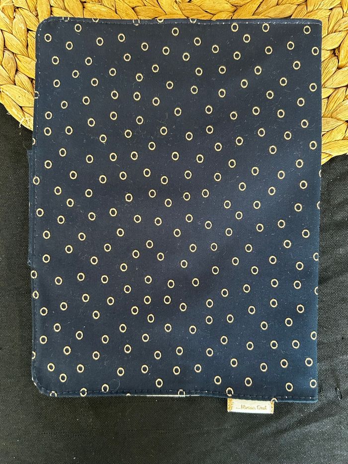 Coton enduit, imperméable, lavable, fermeture scratch. Dimensions : 17 x 23,5 cm. Parfait pour protéger le carnet de bébé au quotidien.