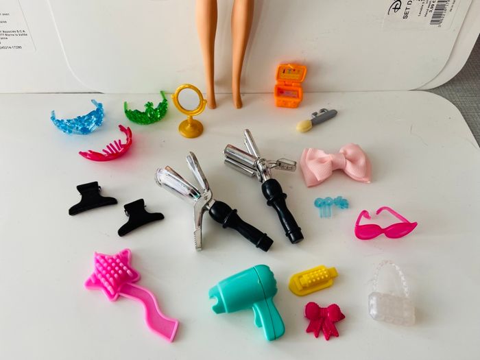 Poupée barbie coiffeuse maquilleuse Il y a une sèche cheveux plaque Des couronnes Palettes maquillage Lunette Barrettes miroir bigoudis Sac à main