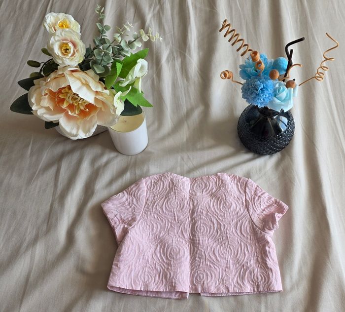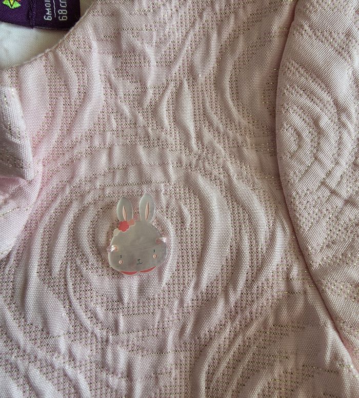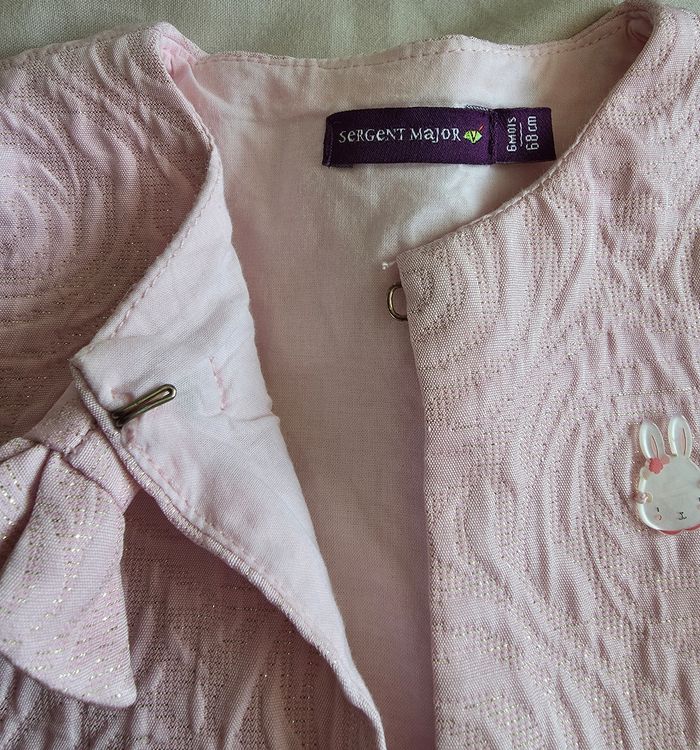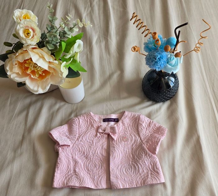 ​✨ ÉTAT : Très bon état. Le tissu est impeccable, les reflets dorés sont toujours bien brillants et le petit badge lapin est parfaitement conservé. ​📏 TAILLE & COUPE : 6 mois (68 cm). Coupe cardigan court type boléro, idéal pour accompagner une robe de cérémonie ou une tenue élégante. Fermeture discrète par un petit crochet au niveau du col. ​🌿 MATIÈRE : Mélange raffiné de 62% Polyester, 36% Viscose et 2% Fibre métallisée pour l'extérieur (aspect texturé avec fils dorés). Doublure intérieure 100% Coton pour un contact tout doux avec la peau de bébé. ​📦 LIVRAISON : Envoi via Mondial Relay (lockers), Shop2Shop ou Chronopost (point relais physique). ​🎁 Réductions sur les lots activées ! N'hésite pas à parcourir mon dressing pour rentabiliser les frais de port.