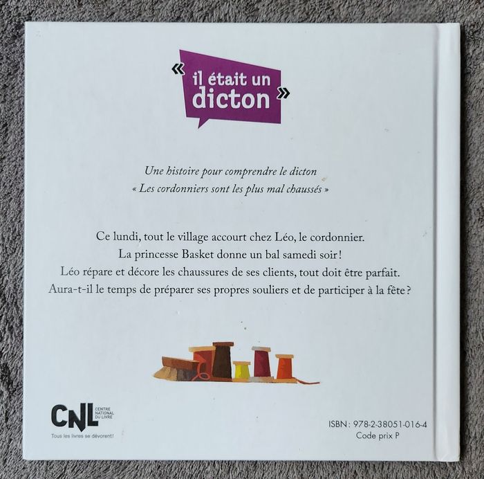 Résumé : Une Histoire pour comprendre le dicton "Les cordonniers sont les plus mal chaussés". Ce lundi, tout le village accourt chez Léo, le Cordonnier. La Princesse Basket donne un bal samedi soir! Léo répare et décore les chaussures de ses clients, tout doit être parfait. Aura-t-il le temps de préparer ses propres souliers et de participer à la fête ?.. Année de parution : 2021. Auteur : Éric-Emmanuel Schmitt. Illustratrice : Caroline Piochon. Collection : Un jour Un dicton. Éditions : Hachette Jeunesse. =) 28 pages. État comme neuf.