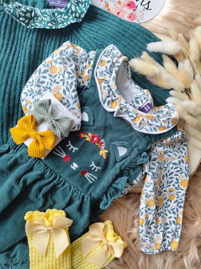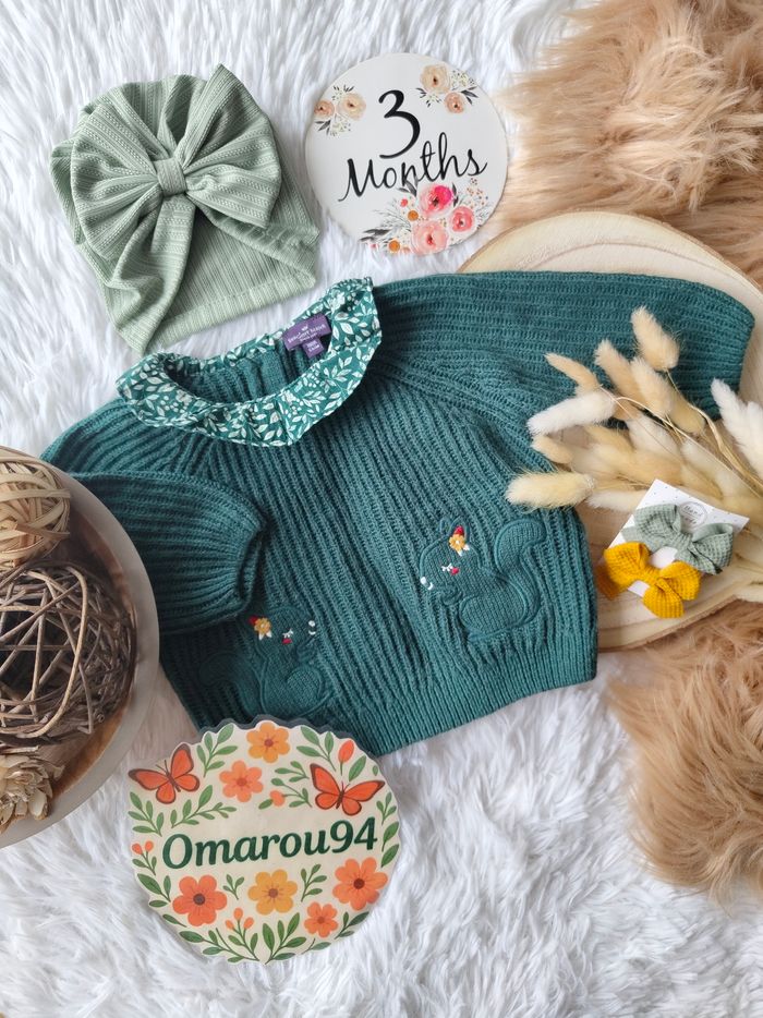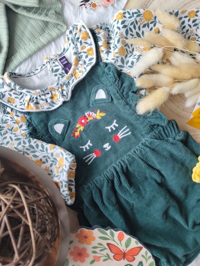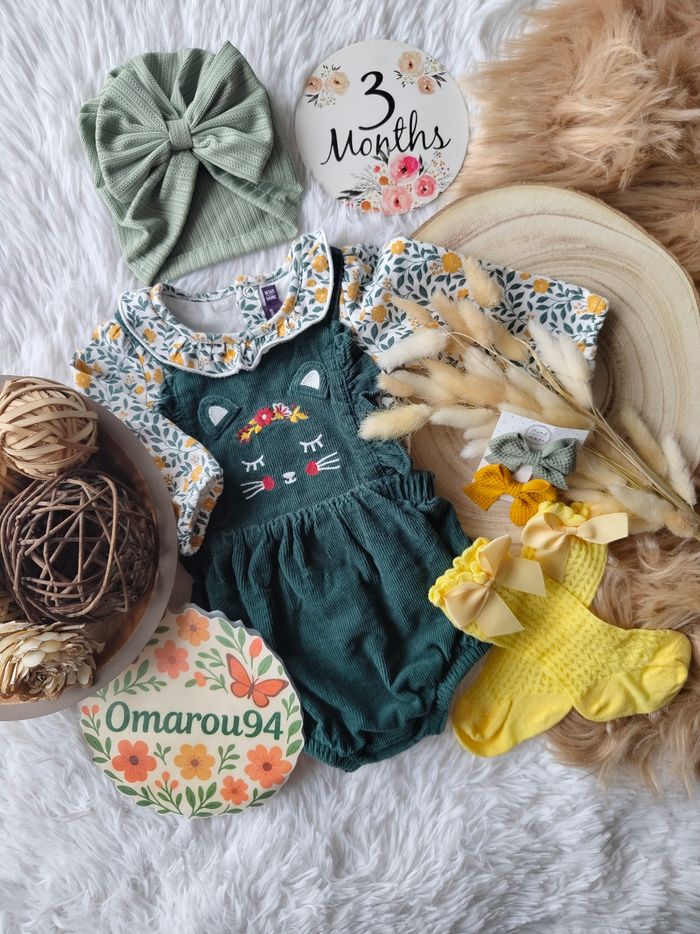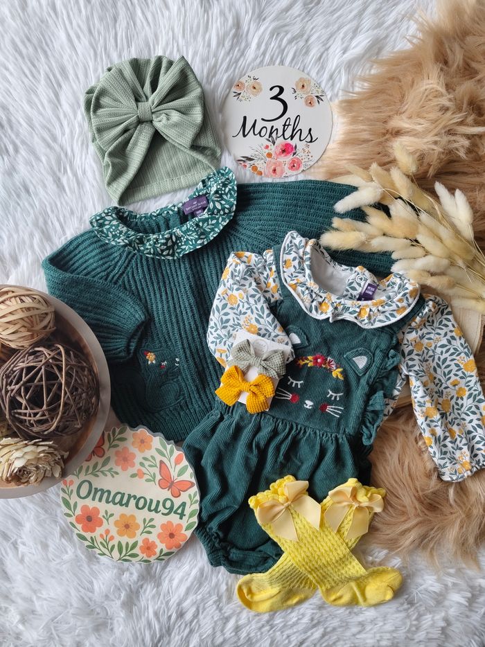 ✅ Excellent état ✅ Ensemble magnifique complet 6 pièces collection "Marmelade à Édimbourg" ✅ Pull tricot col fleuri + body/blouse fleurie manches longues col claudine + barboteuse/salopette courte velours broderie "écureuil"🐿️ ✅ Turban/bonnet Neuf + chaussettes hautes neuves et barrettes cheveux neuves ✅ Automne/hiver