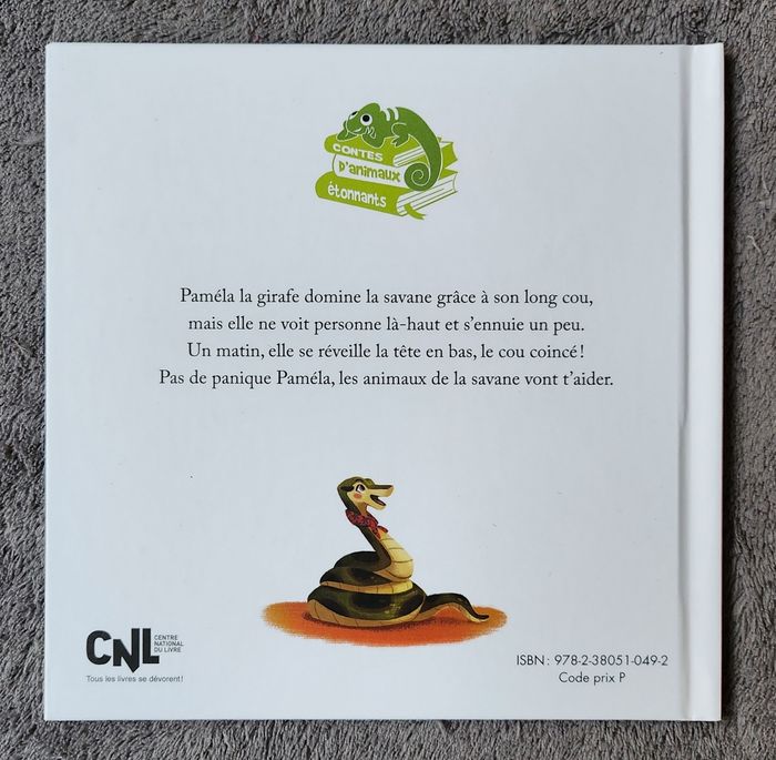 Résumé : Paméla la Girafe domine la savane grâce à son long cou mais elle ne voit personne là-haut et s'ennuie un peu. Un matin, elle se réveille la tête en bas, le cou coincé! Pas de panique Paméla, les animaux de la savane vont t'aider.. Date de parution : 01/03/2022. Auteur : Éric-Emmanuel Schmitt. Illustratrice : Florence Guittard. Collection : Contes d'Animaux Étonnants. Éditions : Hachette Jeunesse. =) 20 pages. État comme neuf.