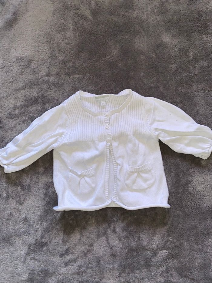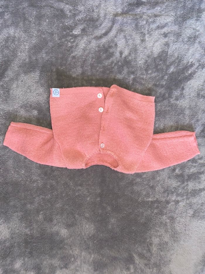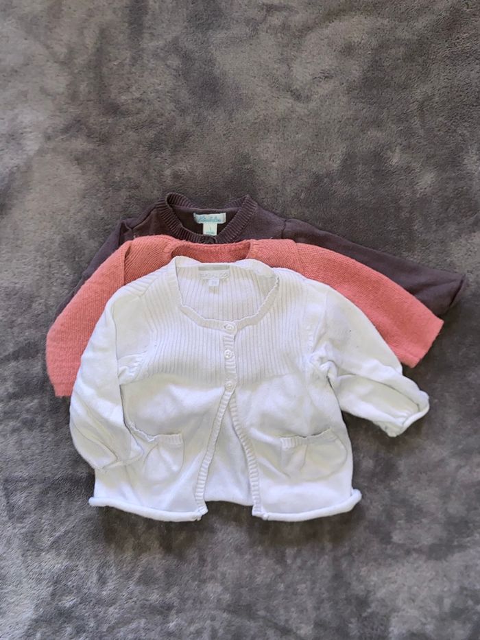 3 gilets en 1 mois - un blanc marque Kimbaloo avec deux petites poches - un rose tricoté en France - un taupe marque Kimbaloo boutons cœurs