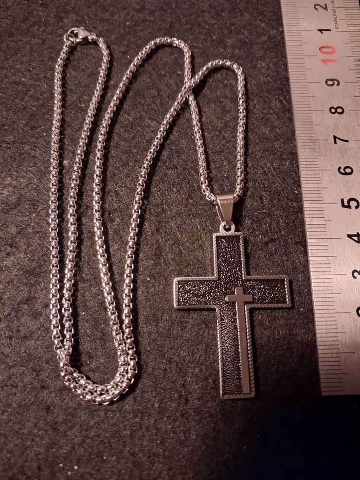 Vend croix chrétienne avec collier en acier de couleur grise et noir.