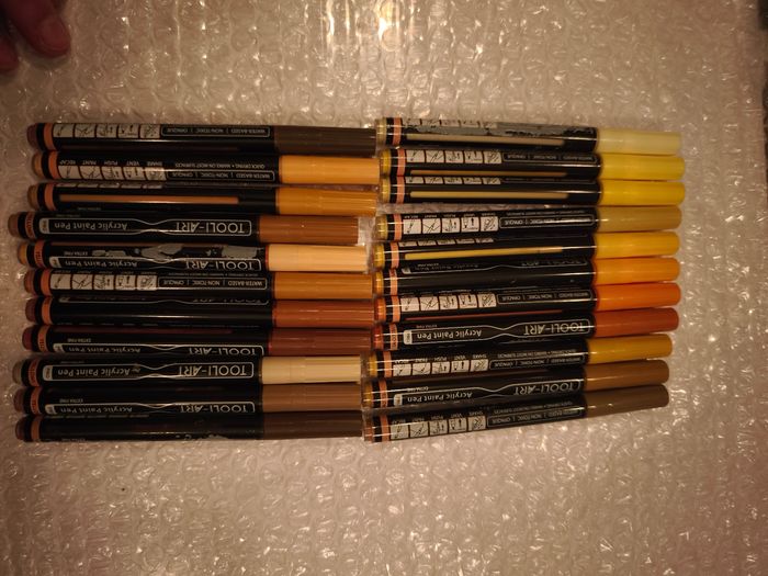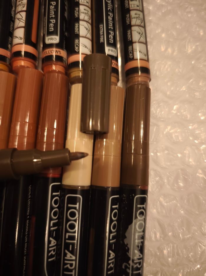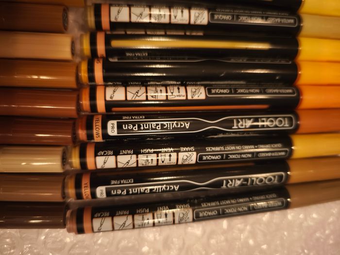Lot de feutres acryliques Tooli-Art Acrylic Paint Pen. Couleurs dans les tons marron / beige / jaune (idéal portraits, bois, détails, ombrages). ✔ Pointe fine ✔ Peinture acrylique couvrante ✔ Adapté papier, bois, toile, pierre, DIY Utilisés mais en bon état (voir photos). Rangement non fourni. Vendus en lot uniquement. Envoi soigné 📦