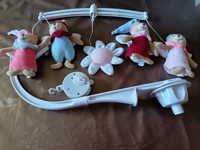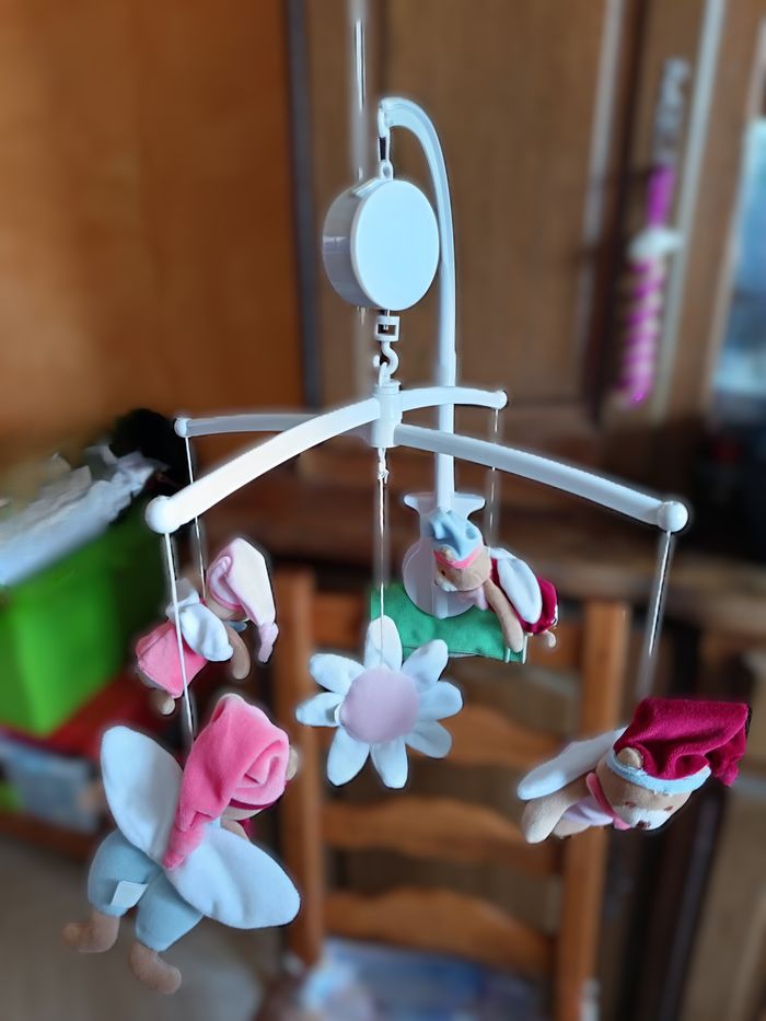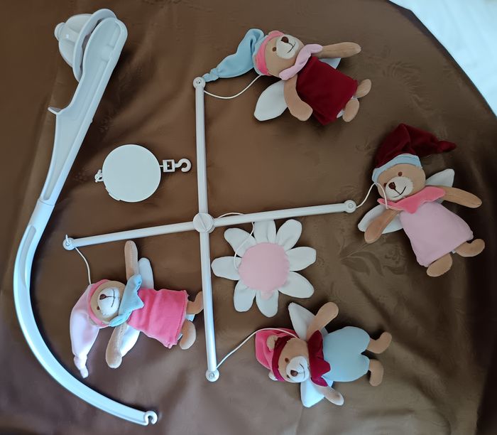 Mobile musical D&C Possibilité de l'installer avec ou sans la boite musical. Il est en excellent état et propre. Juste au niveau du maintien lorsque l'on veut accrocher la boite musicale sur la surpension, j'ai dû égarer quelque chose car elle ne rentre pas dans le crochet donc j'ai mis une attache provisoire que vous pourrez éventuellement changer. D'où petit prix. Sinon, la boite musicale fonctionne très bien. Il suffit de se servir du remontoir (avant dernière photo) afin de la mettre en route. Possibilité de l'arrêter en plein fonctionnement grace au bouton poussoir (dernière photo). Attention ! La couleur réelle peut être un peu différente en raison de la luminosité lors de la prise de photo.
