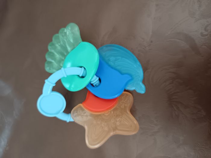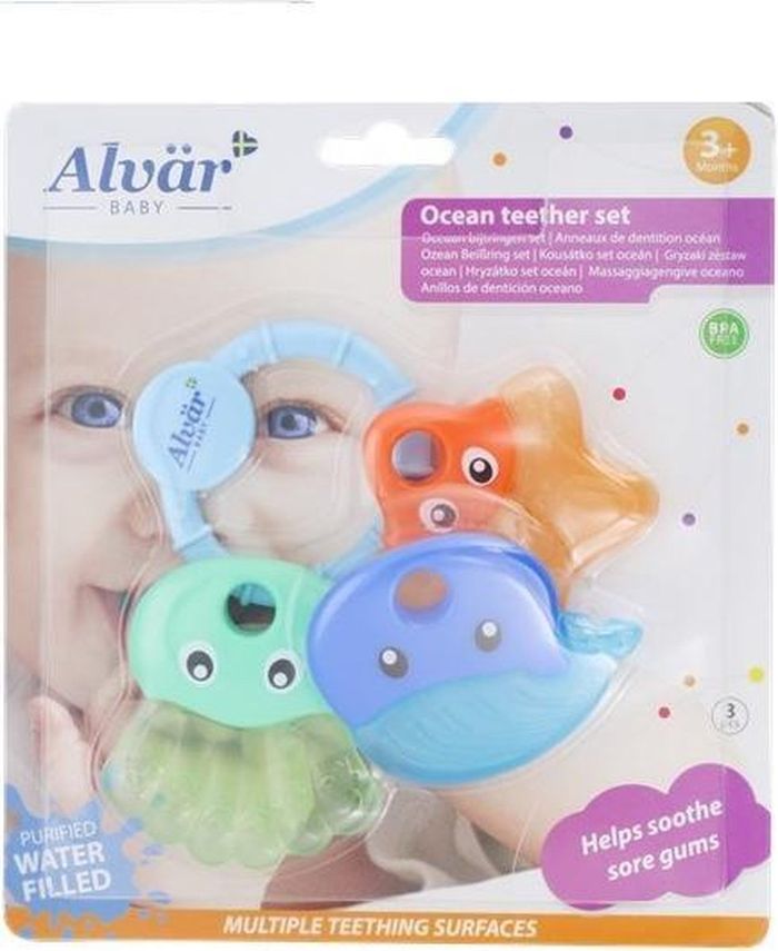 Ensemble de 3 anneaux de dentition "Océan" Marque ALVAR Couleurs : bleu, vert, orange Ces anneaux de dentition aideront à apaiser la douleur et l'inconfort des gencives de votre bébé. Le matériau océanique doux et frais stimule les lèvres et la langue pour un développement buccal sain, tandis que les différentes formes et couleurs favorisent la motricité de votre bébé. Placez la (les) clé(s) à mordre dans le réfrigérateur, pas dans le congélateur, elles assurent un refroidissement doux grâce au liquide à l'intérieur. Attention ! La couleur réelle peut être un peu différente en raison de la luminosité lors de la prise de photo. Ici la couleur réelle est un peu plus foncée que sur les photos.