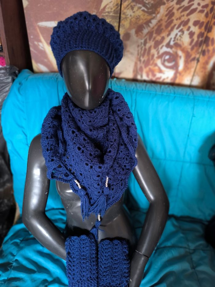 Châle bleu avec un fil brillant assorti avec un joli beret et une paire de mitaines