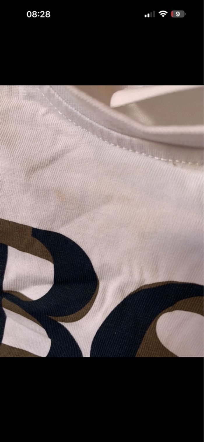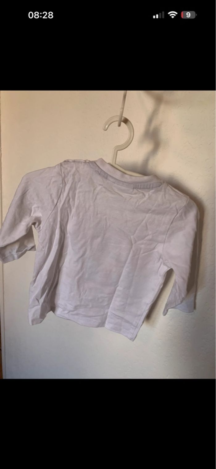 Vend t-shirt manche longue blanc , porter une fois , deux légères taches au niveau du col. Taille 12M 74 cm