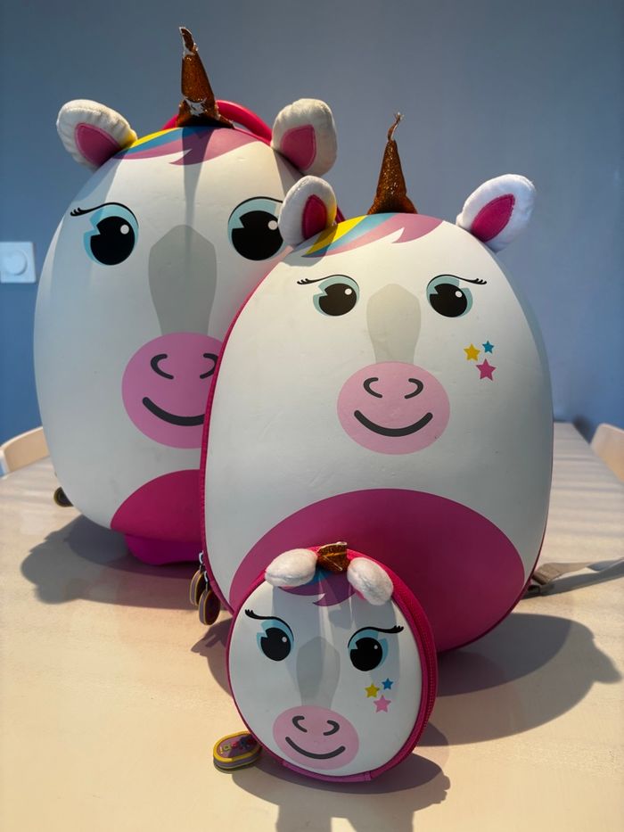 Je vends cet ensemble de valises enfant ( valise, sac à dos et porte monnaie)composé de trois pièces aux designs amusants et colorés. Parfait pour les petits voyageurs qui veulent voyager avec style ! - Type de produit : Ensemble valise cabine - Univers : Enfant - Matière : Plastique rigide - Couleur : Blanc et rose avec détails multicolores - Fonctionnalités : 2 roulettes, Poignée de transport, Design licorne avec cornes paillettes doré et crinière arc-en-ciel - Aménagement : 1 valise, sac à dos et porte monnaie. Bon état (marque de feutre intérieur valises.