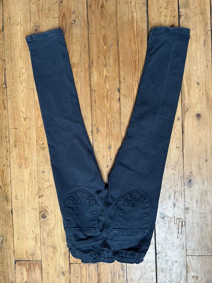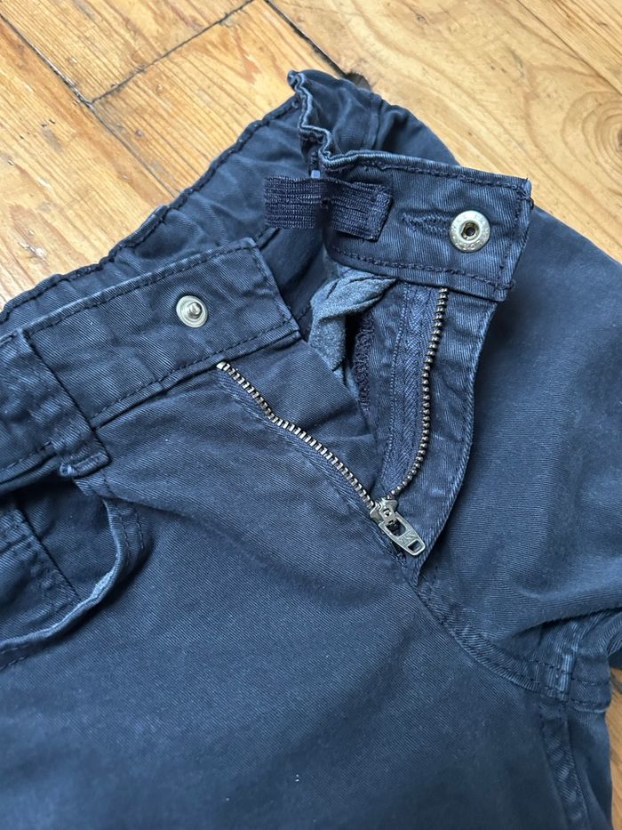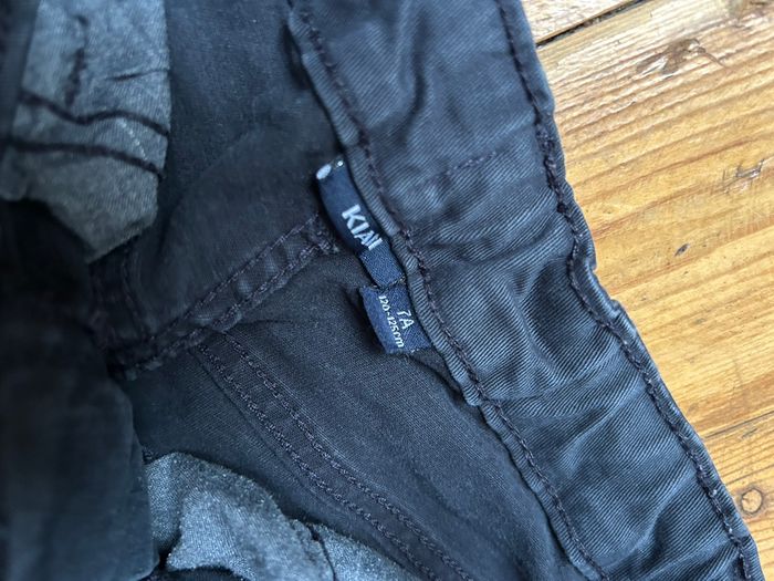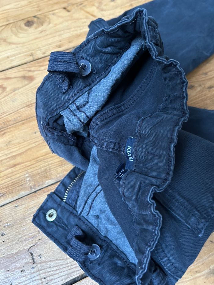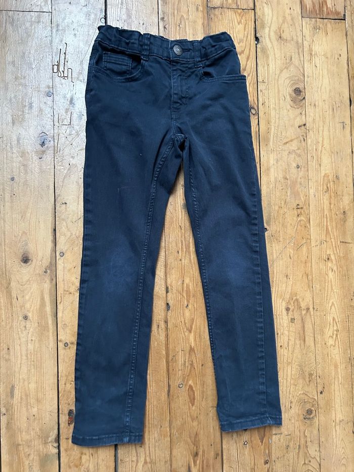 Jeans denim bien stretch bleu marine Réglable à la ceinture Fermeture pression Taille 7 ans 120-125 cm Kiabi 97% coton 3% elastane Bon état car un peu bouloché sur un genou et une tache trait rouge sur la même jambe