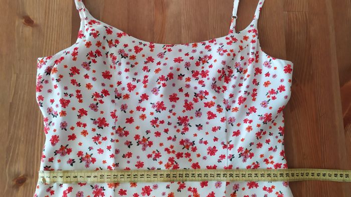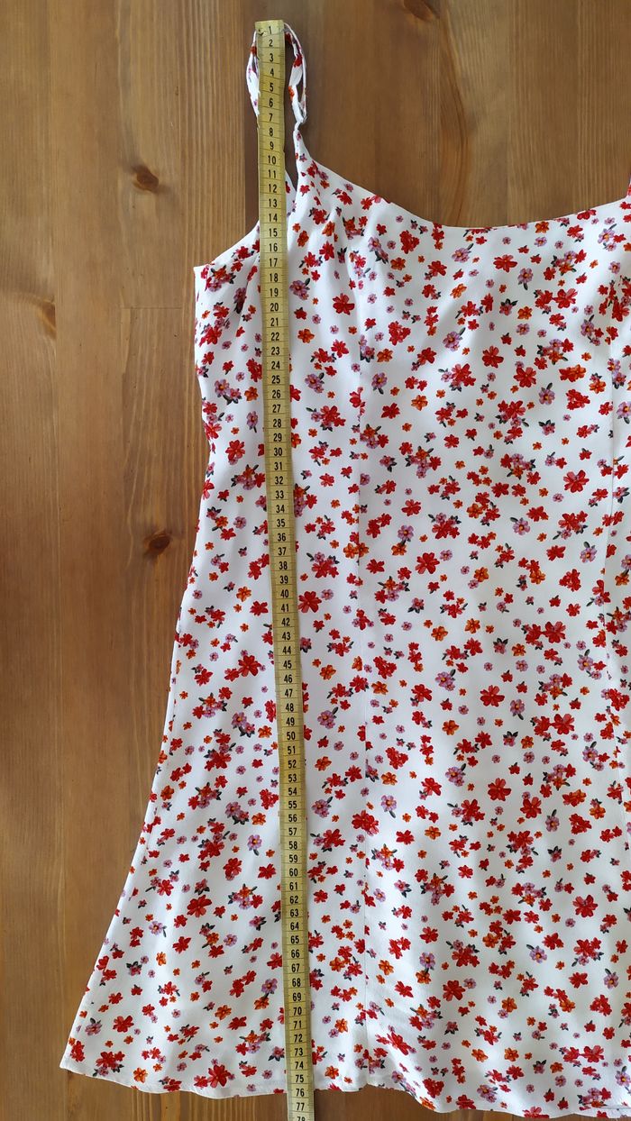 Robe doublée en très bon état, portée quelques fois pendant 2 étés. Aucun défaut. Composition: 100% viscose Mesures: - Largeur taille : 39 cm - Longueur réglable grâce aux bretelles: entre 76 cm et 83 cm