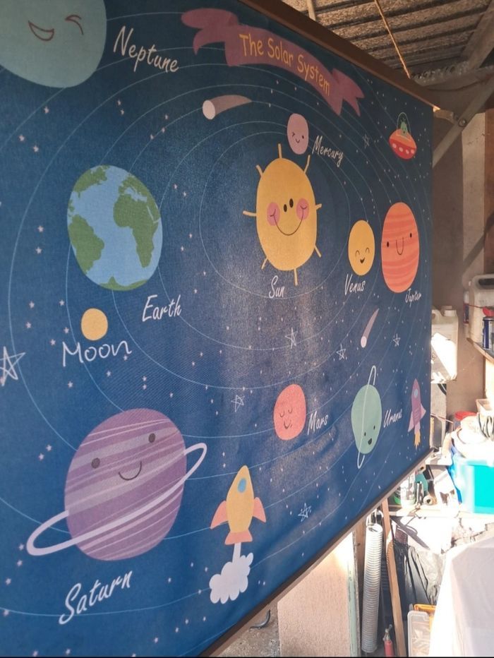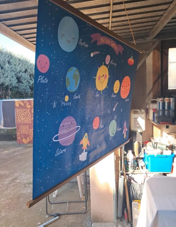 Jolie tableau en tissus Planète Léger Quelque tache brune derrière ne gêne en rien devant on les voit pas une fois accroché aux mur D'où le prix