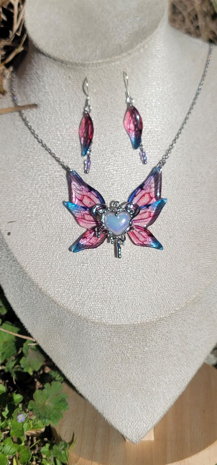 Parure elfique ensemble collier et boucles d'oreilles en argent aile de fée papillon  - photo numéro 1