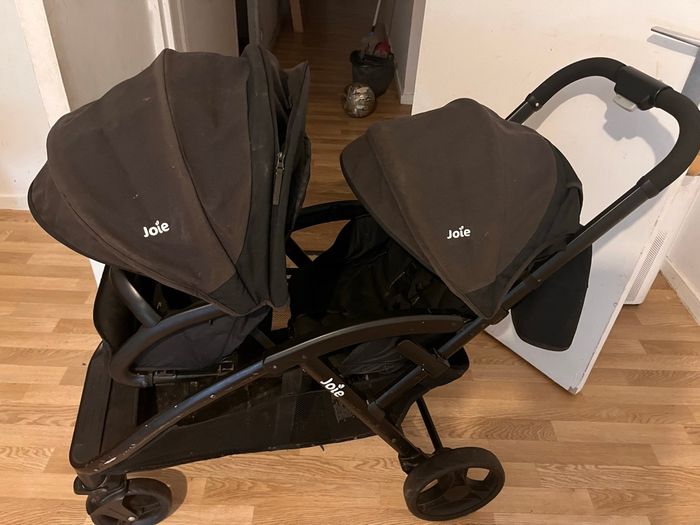 Poussette double Joie pour jumeaux en bon état. Modèle côte à côte, pratique et confortable. Les deux sièges s’inclinent et les capotes protègent bien du soleil. Poussette facile à plier et à transporter. Roues en bon état, fonctionne parfaitement. Idéale pour jumeaux ou enfants d’âges rapprochés.