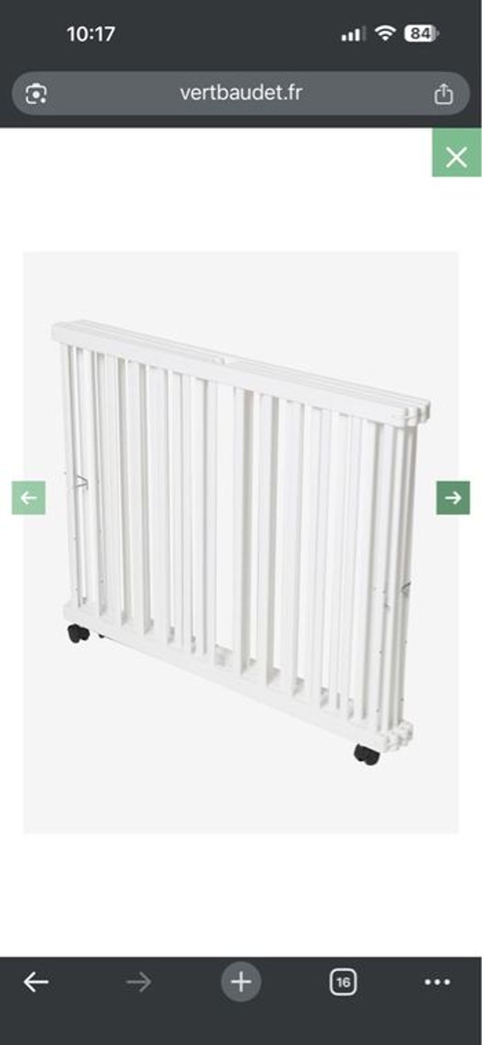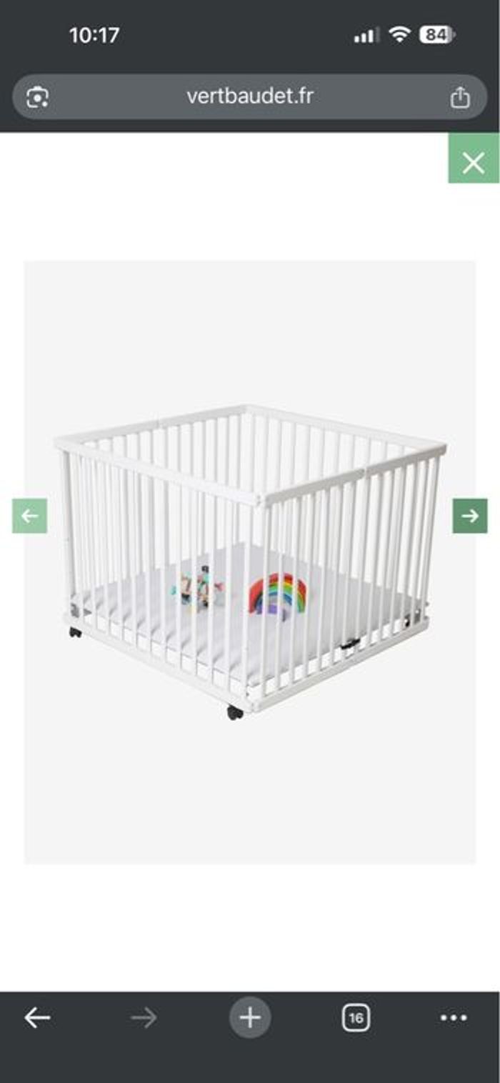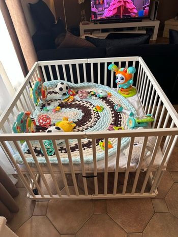 Je vends un parc pliant en bois Vertbaudet, acheté neuf en magasin il y a 6 mois (valeur 200 €). ✔ Très bon état ✔ Utilisé seulement quelques mois ✔ Se plie facilement pour rangement ✔ 4 roulettes avec freins ✔ Fond réglable sur 3 niveaux ✔ Dimensions : 95 x 95 cm Le parc est vendu avec : – Le fond de parc d’origine – Un matelas supplémentaire déhoussable et lavable en machine (acheté en plus pour plus de confort) Très pratique et solide. Petite précision : légères traces d’usure à certains endroits (petites écaillures dues aux jouets accrochés), visibles sur photos. Rien qui gêne l’utilisation. Disponible rapidement. Remis en main propre possible. Envoi possible (colis volumineux).
